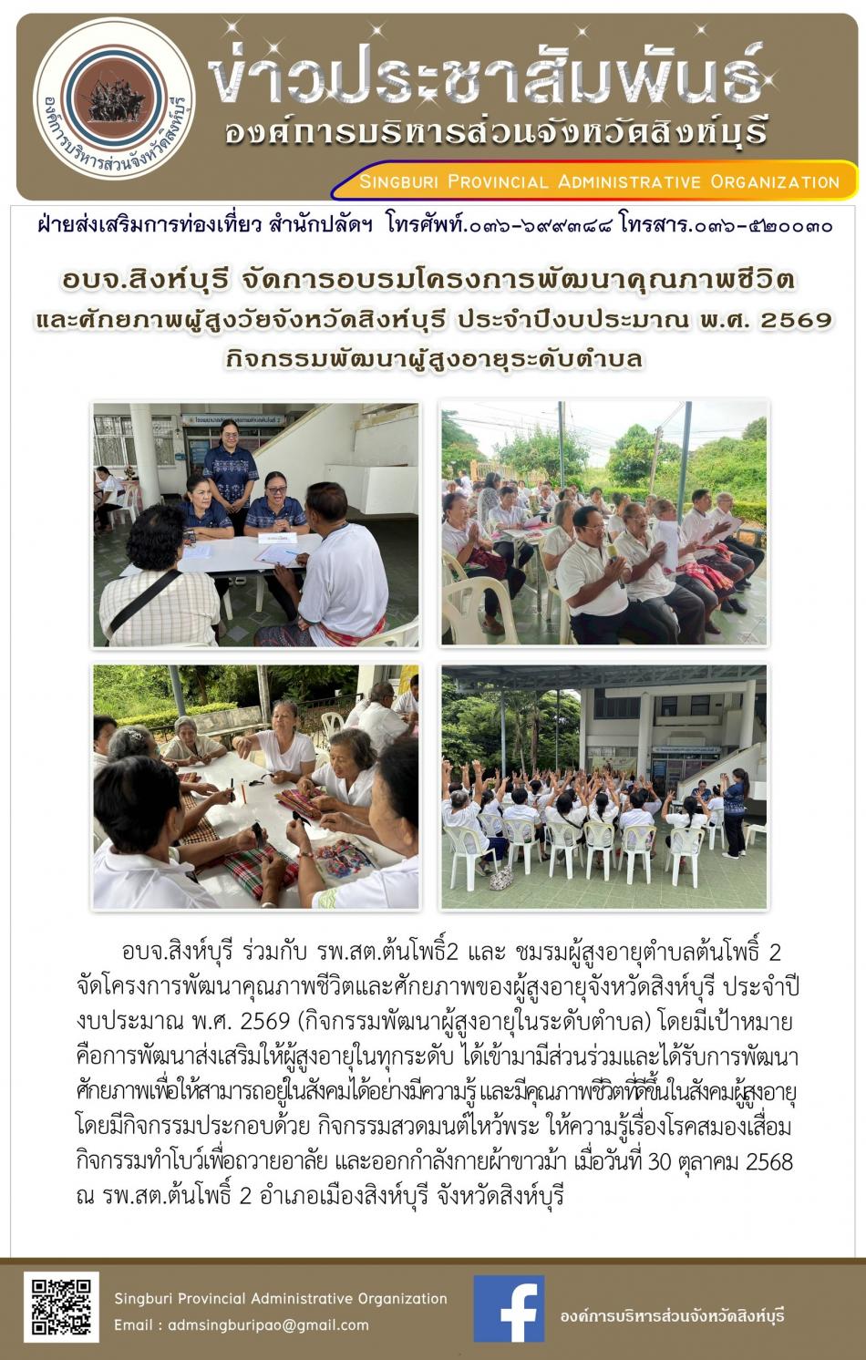 อบจ.สิงห์บุรี จัดโครงการพัฒนาคุณภาพชีวิตและศักยภาพของผู้สูงอายุ จังหวัดสิงห์บุรี ประจำปีงบประมาณ พ.ศ. 2569 กิจกรรมพัฒนาผู้สูงอายุระดับตำบล [30 ตุลาคม 2568]