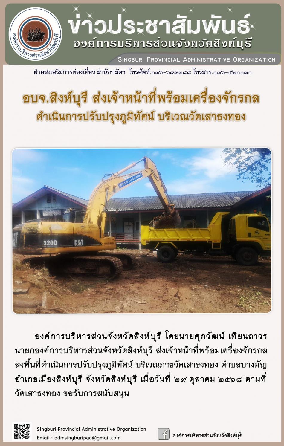 อบจ.สิงห์บุรี ส่งเจ้าหน้าที่พร้อมเครื่องจักรกล ดำเนินการปรับปรุงภูมิทัศน์ บริเวณวัดเสาธงทอง [29 ตุลาคม 2568]