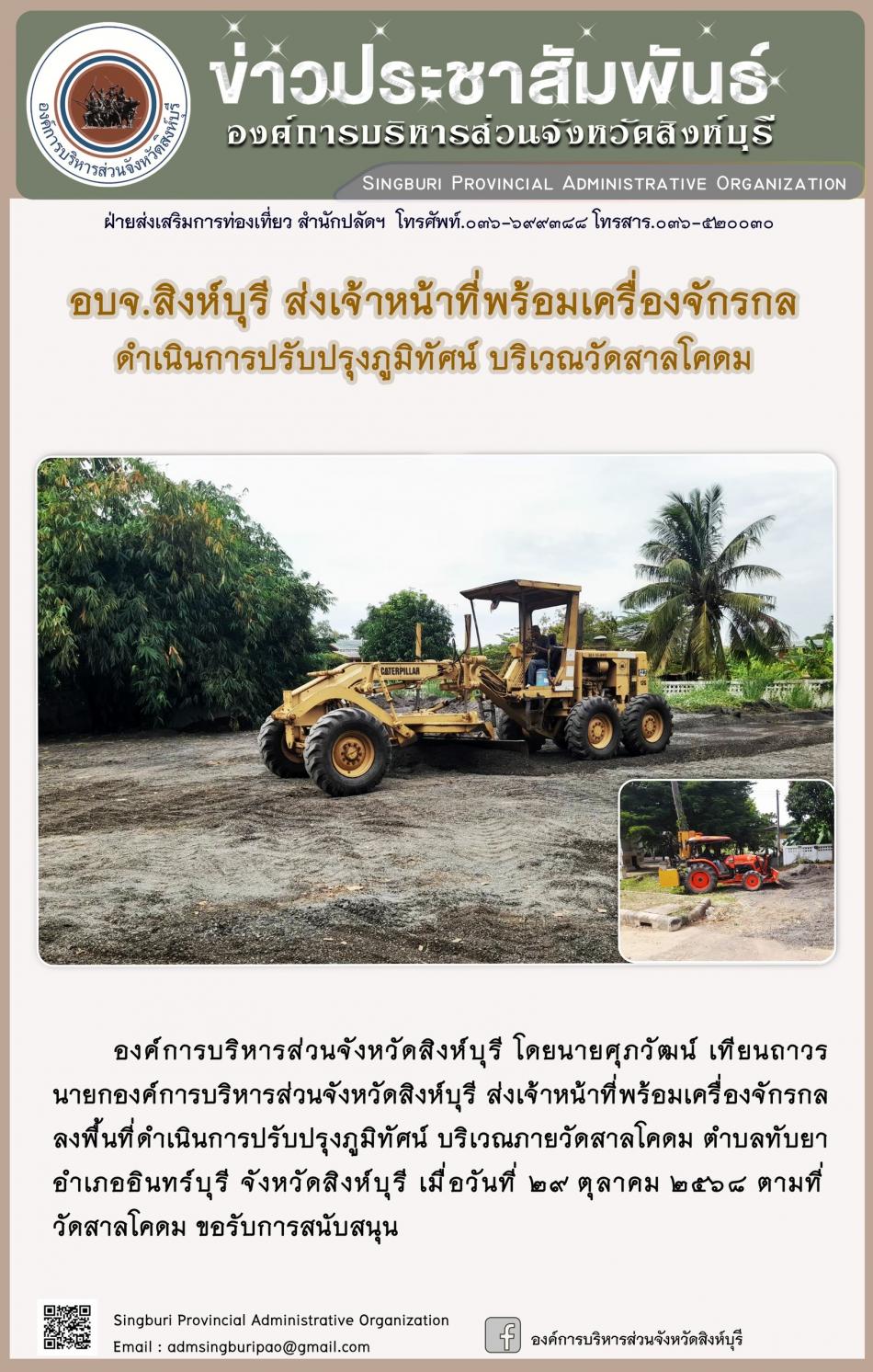 อบจ.สิงห์บุรี ส่งเจ้าหน้าที่พร้อมเครื่องจักรกล ดำเนินการปรับปรุงภูมิทัศน์ บริเวณวัดสาลโคดม [29 ตุลาคม 2568]