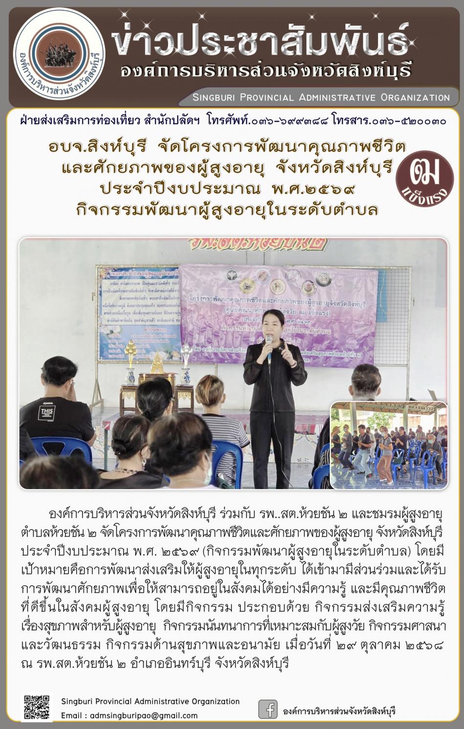 อบจ. สิงห์บุรี จัดโครงการพัฒนาคุณภาพชีวิตและศักยภาพของผู้สูงอายุ จังหวัด สิงห์บุรี ประจำประจำปีงบประมาณปี พ. ศ. 2569 กิจกรรมพัฒนาผู้สูงอายุในระดับตำบลกิจกรรมพัฒนาผู้สูงอายุในระดับตำบล [29 ตุลาคม 2568]