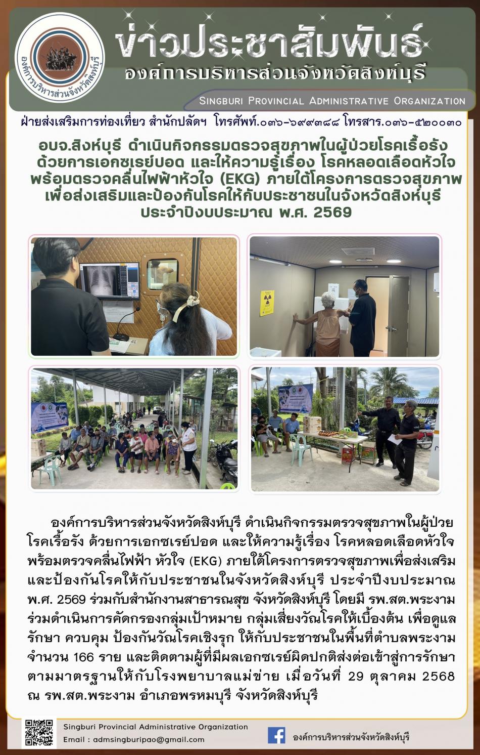 อบจ.สิงห์บุรี ดำเนินกิจกรรมตรวจสุขภาพในผู้ป่วยโรคเรื้อรังด้วยการเอกซเรย์ปอดและให้ความรู้เรื่องโรคหลอด เลือดหัวใจพร้อมตรวจคลื่นไฟฟ้าหัวใจ ( EKG)... [29 ตุลาคม 2568]