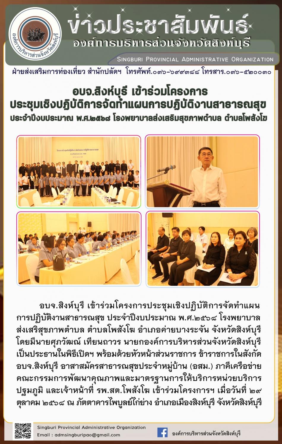 อบจ.สิงห์บุรี เข้าร่วมโครงการประชุมเชิงปฏิบัติการจัดทำแผนการปฏิบัติงานสาธารณสุขประจำปีงบประมาณ พ.ศ.2568 โรงพยาบาลส่งเสริมสุขภาพตำบลโพสังโฆ [29 ตุลาคม 2568]