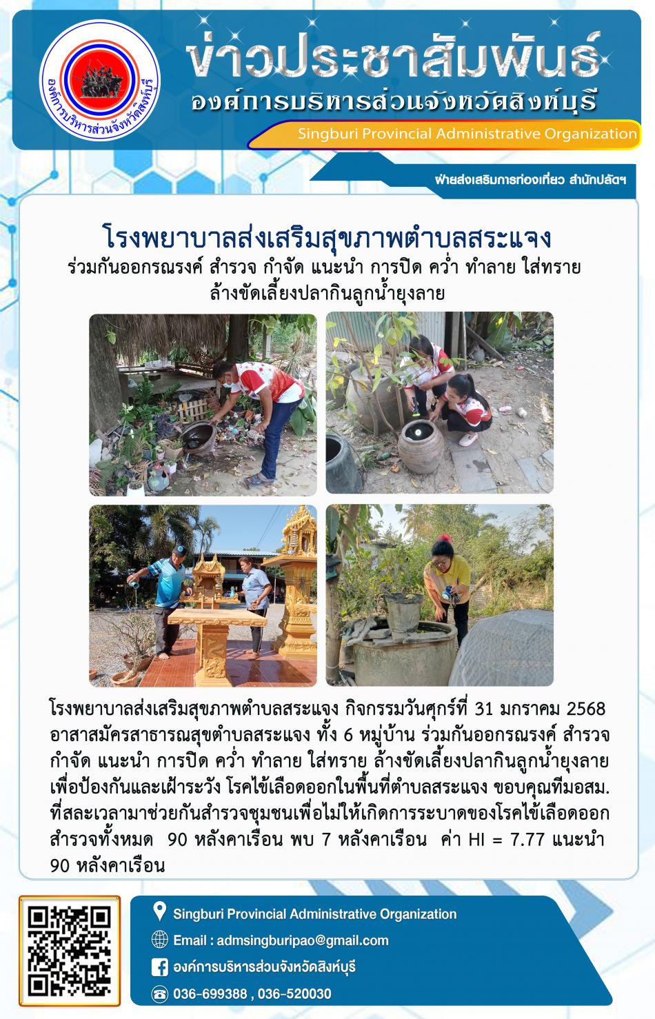 โรงพยาบาลส่งเสริมสุขภาพตำบลสระแจง ร่วมกันออกรณรงค์ สำรวจ กำจัด แนะนำ การปิด คว่ำ ทำลาย ใส่ทราย ล้างขัดเลี้ยงปลากินลูกน้ำยุงลาย [31 มกราคม 2568]