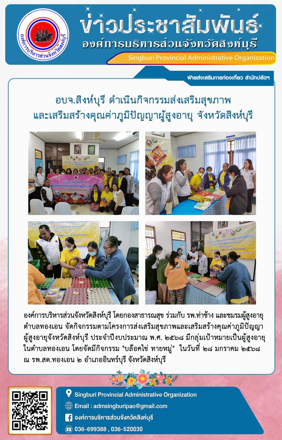 อบจ.สิงห์บุรี ดำเนินโครงการส่งเสริมสร้างสุขภาพและเสริมสร้างคุณค่าภูมิปัญญาผู้สูงอายุจังหวัดสิงห์บุรี [28 มกราคม 2568]
