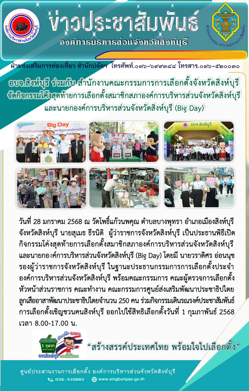 อบจ.สิงห์บุรี ร่วมกับสำนักงานคณะกรรมการการเลือกตั้ง รณรงค์ประชาสัมพันธ์เชิญชวนเลือกตั้ง สมาชิกสภาองค์การบริหารส่วนจังหวัดสิงห์บุรี และนายกองค์การบริหารส่วนจังหวัดสิงห์บุรี (Big Day) [28 มกราคม 2568]