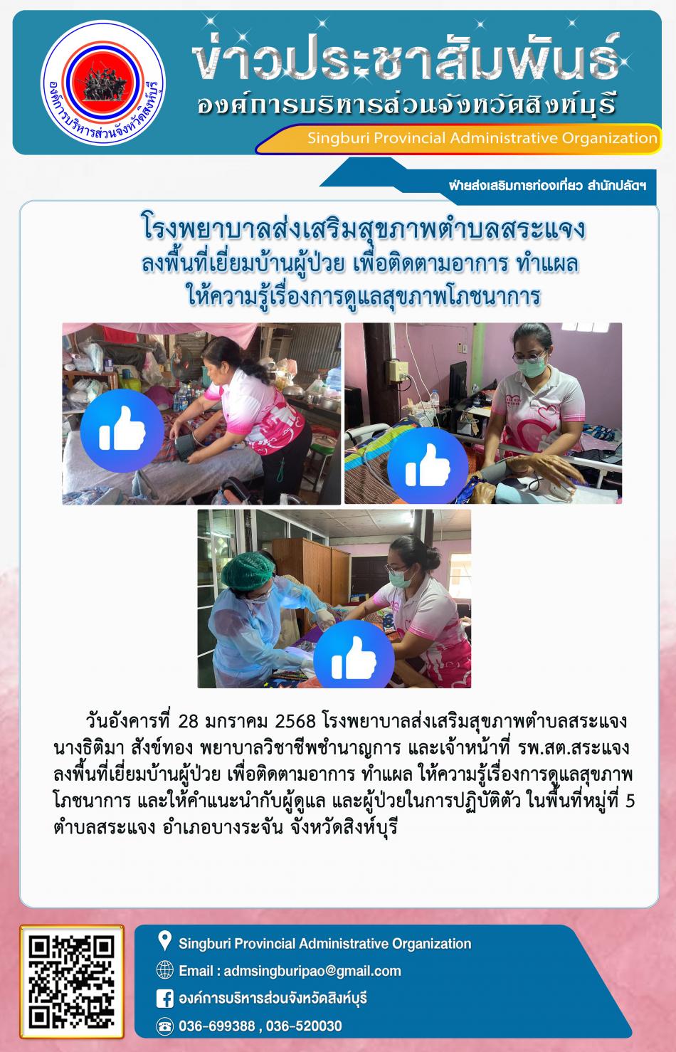 โรงพยาบาลส่งเสริมสุขภาพตำบลสระแจง ลงพื้นที่เยี่ยมเยี่ยมบ้านผู้ป่วย เพื่อติดตามอาการ ทำแผลให้ความรู้เรื่องการดูแลสุขภาพโภชนาการ [28 มกราคม 2568]