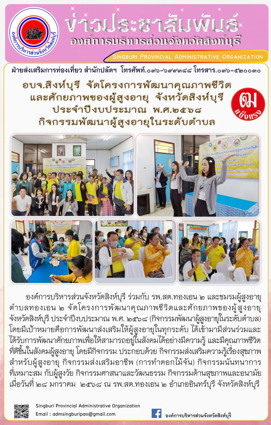 อบจ.สิงห์บุรี จัดโครงการพัฒนาคุณภาพชีวิตและศักยภาพผุ้สูงอายุจังหวัดสิงห์บุรี ประจำปีงบประมาณพ.ศ.2568 กิจกรรมพัฒนาผู้สูงอายุในระดับตำบล [28 มกราคม 2568]