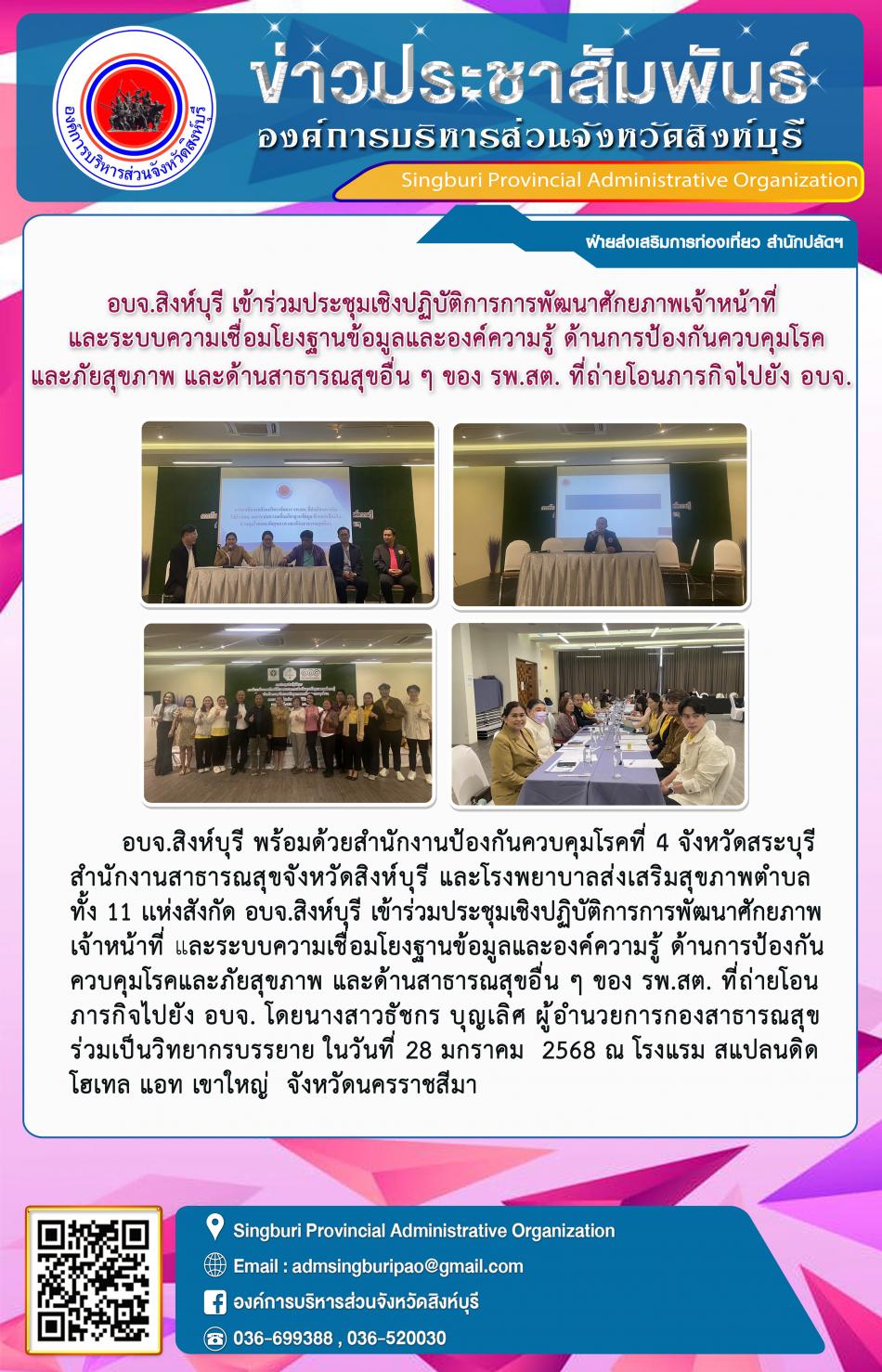 อบจ.สิงห์บุรี เข้าร่วมประชุมเชิงปฏิบัติการการพัฒนาศักยภาพเจ้าหน้าที่และระบบความเชื่อมโยงฐานข้อมูลและองค์ความรู้ ด้านการป้องกันควบคุมโรคและภัยสุขภาพ และด้านสาธารณสุขอื่นๆ ของ รพ.สต.ที่ถ่ายโอนภารกิจไปยัง อบจ. [28 มกราคม 2568]