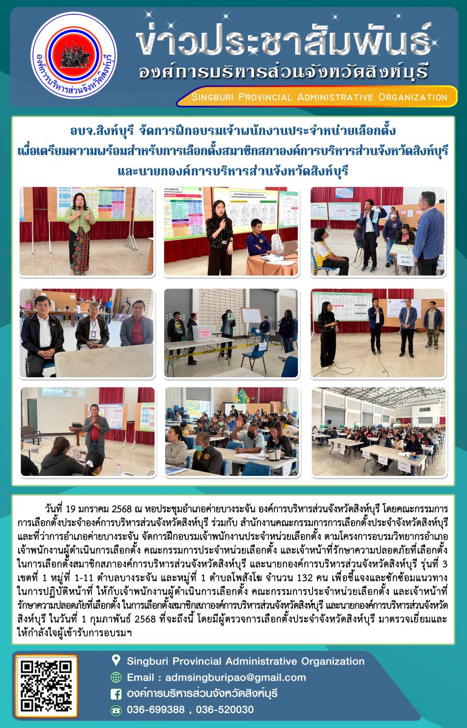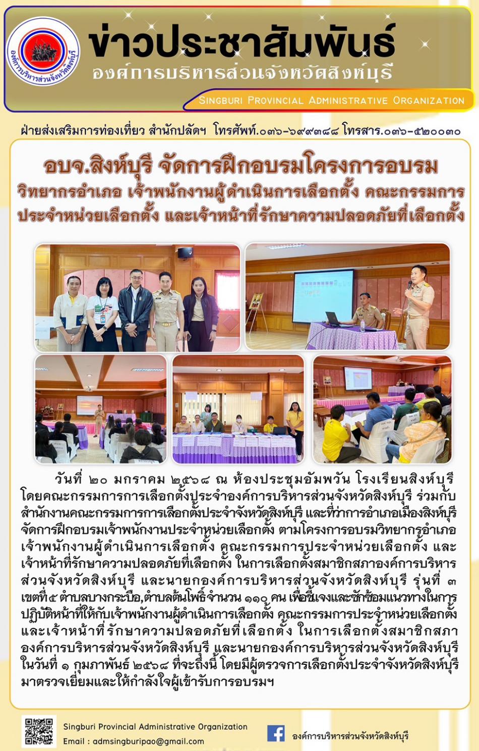 อบจ.สิงห์บุรี จัดการฝึกอบรมโครงการอบรมวิทยากรอำเภอ เจ้าพนักงานดำเนินการเลือกตั้ง คณะกรรมการประจำหน่วยเลือกตั้ง และเจ้าหน้าที่รักษาความปลอดภัยที่เลือกตั้ง [20 มกราคม 2568]