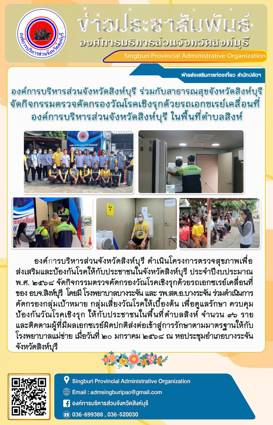 องค์การบริหารส่วนจังหวัดสิงห์บุรี ร่วมกับ สำนักงานสาธารณสุขจังหวัดสิงห์บุรี จัดกิจกรรมตรวจคัดกรองวัณโรคเชิงรุกด้วยรถเอกซเรย์เคลื่อนที่องค์การบริหารส่วนจังหวัดสิงห์บุรี ในพื้นที่สิงห์ [20 มกราคม 2568]