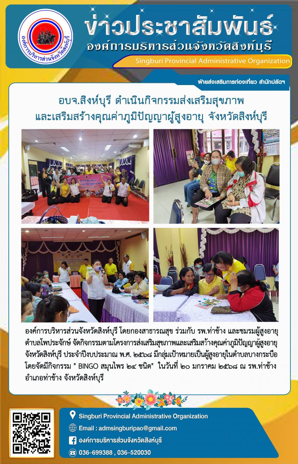 อบจ.สิงห์บุรี ดำเนินกิจกรรมส่งเสริมสุขภาพ และเสริมสร้างคุณค่าภูมิปัญญาให้กับผู้สุงอายุ จังหวัดสิงห์บุรี [20 มกราคม 2568]