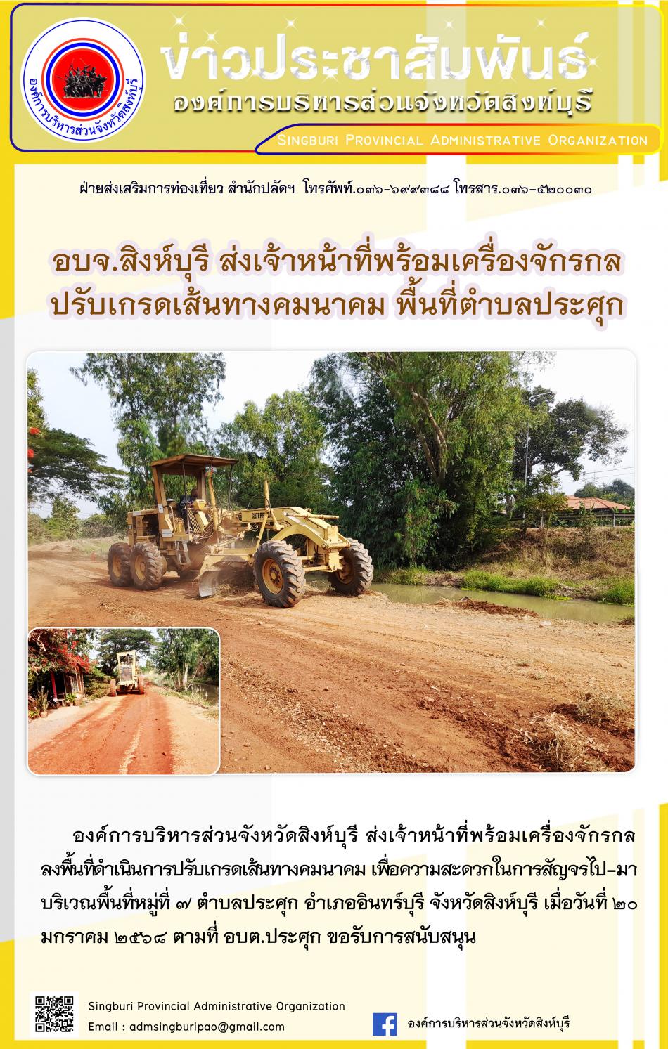 อบจ.สิงห์บุรี ส่งเจ้าหน้าที่พร้อมเครื่องจักรกล ปรับเกรดเส้นทางคมนาคม พื้นที่ตำบลประศุก [20 มกราคม 2568]