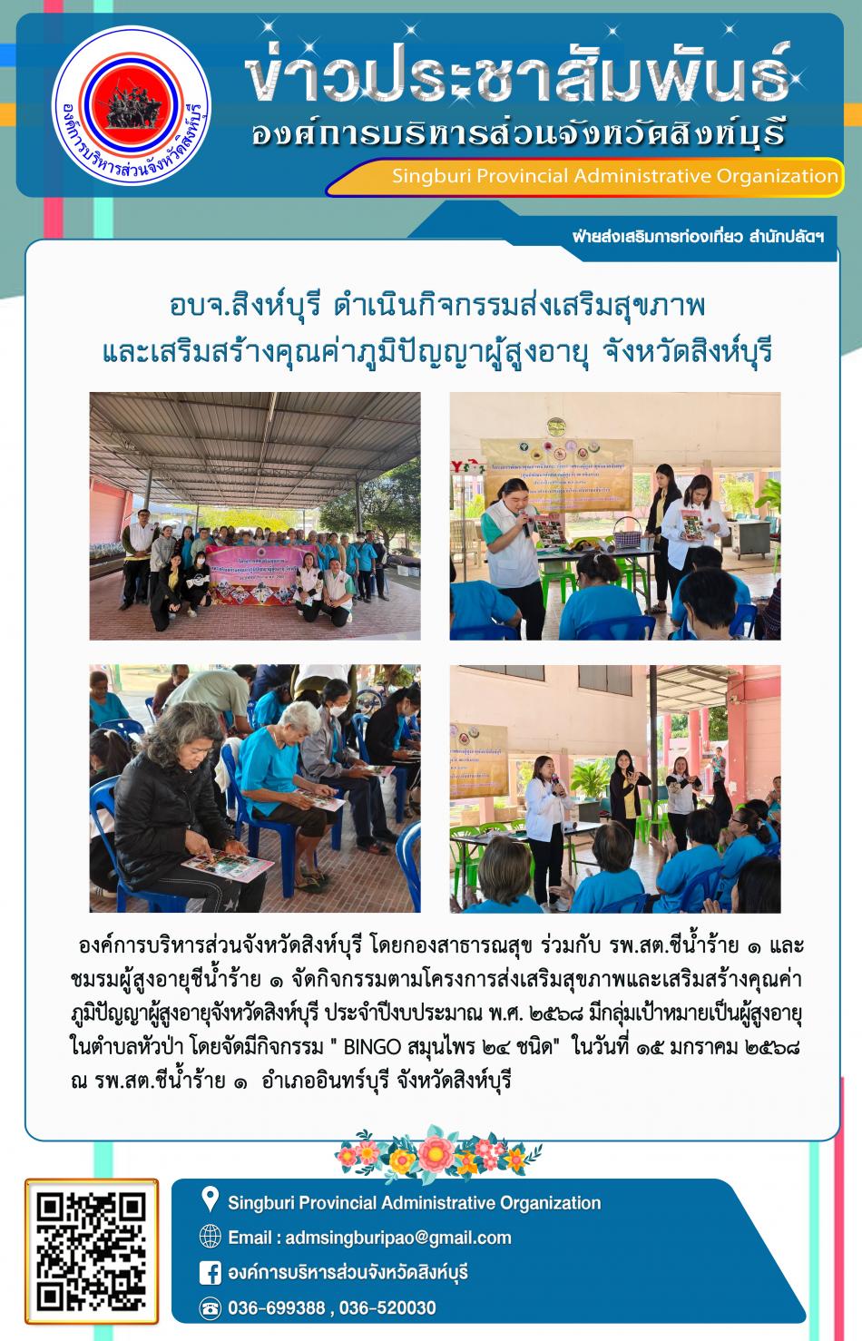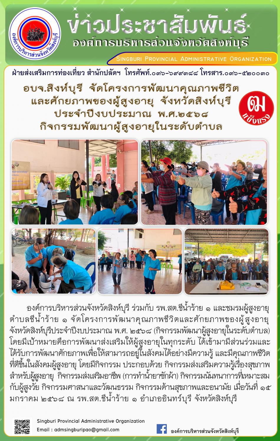 อบจ.สิงห์บุรี ดำเนินโครงการ ส่งเสริมสุขภาพและเสริมสร้างคุณค่าภูมิปัญญาผู้สูงอายุจังหวัดสิงห์บุรี [15 มกราคม 2568]