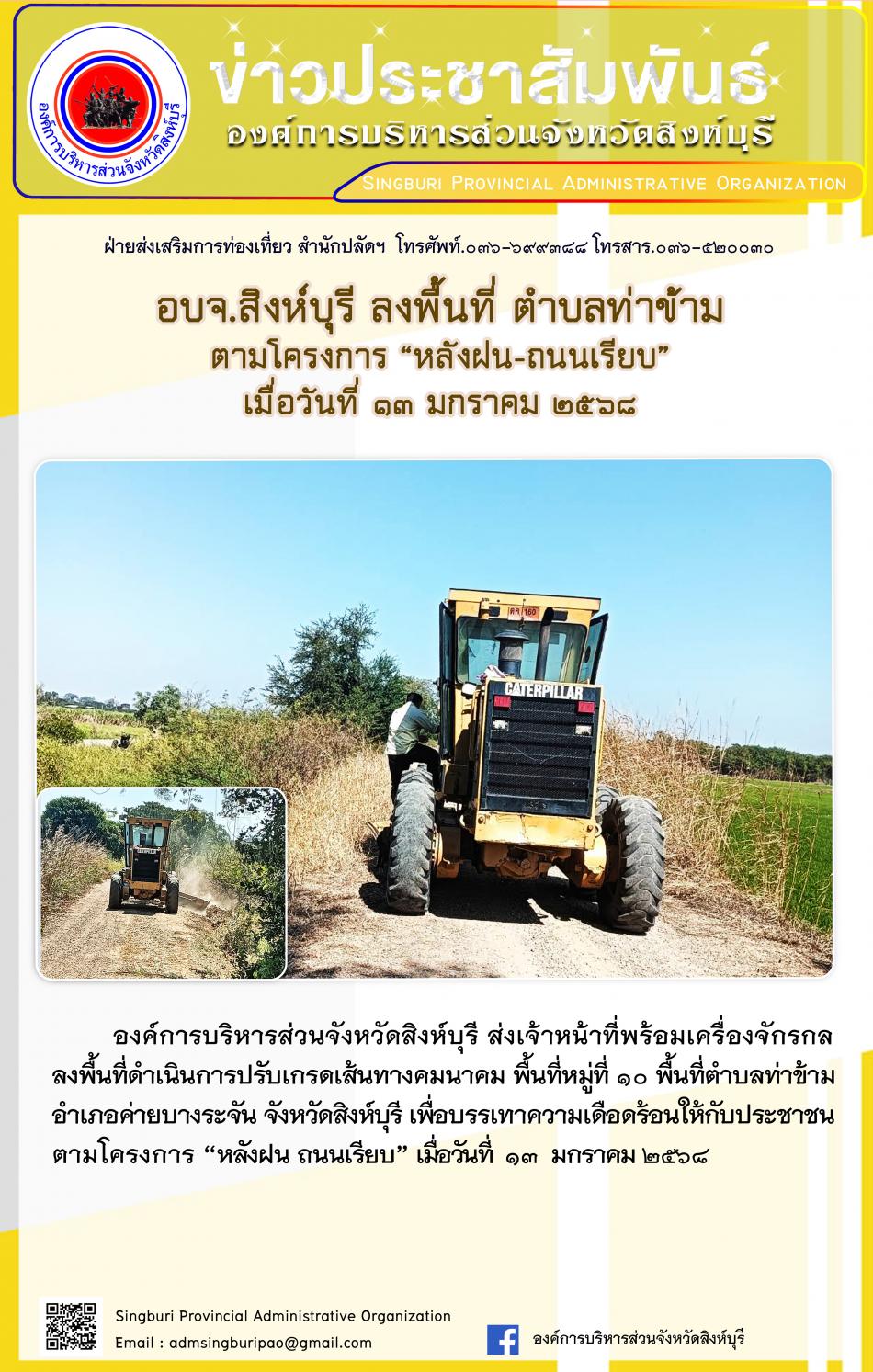 อบจ.สิงห์บุรี ลงพื้นที่ ตำบลท่าข้าม ตามโครงการ "หลังฝน - ถนนเรียบ" [13 มกราคม 2568]