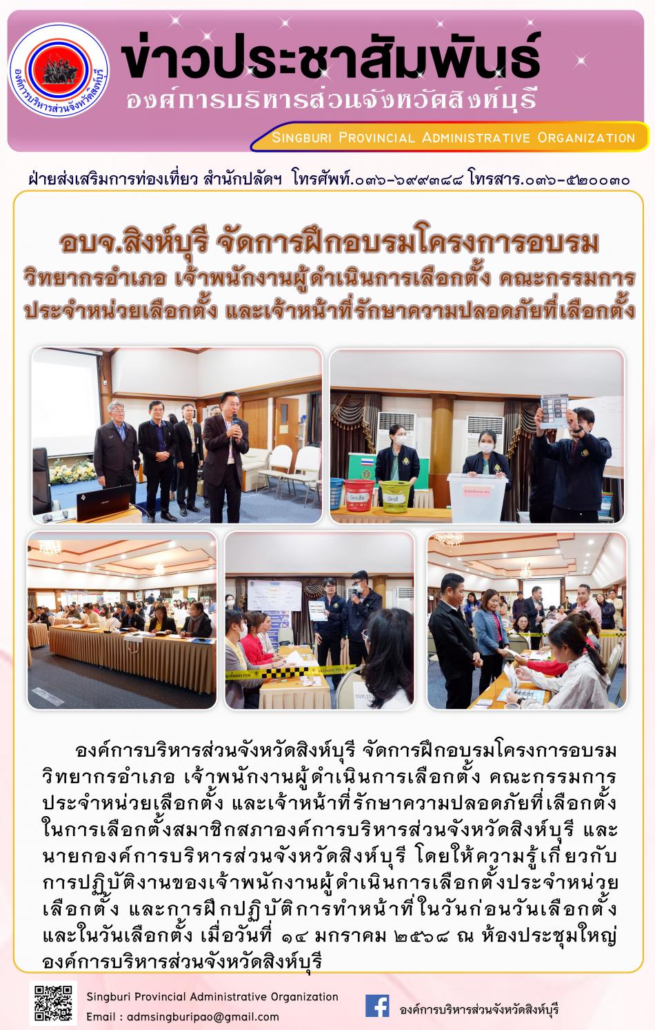 อบจ.สิงห์บุรี จัดการฝึกอบรมโครงการอบรมวิทยากรอำเภอ เจ้าพนักงานผู้ดำเนินการเลือกตั้ง คณะกรรมการประจำหน่วยเลือกตั้ง และเจ้าหน้าที่รักษาความปลอดภัยที่เลือกตั้ง [14 มกราคม 2568]