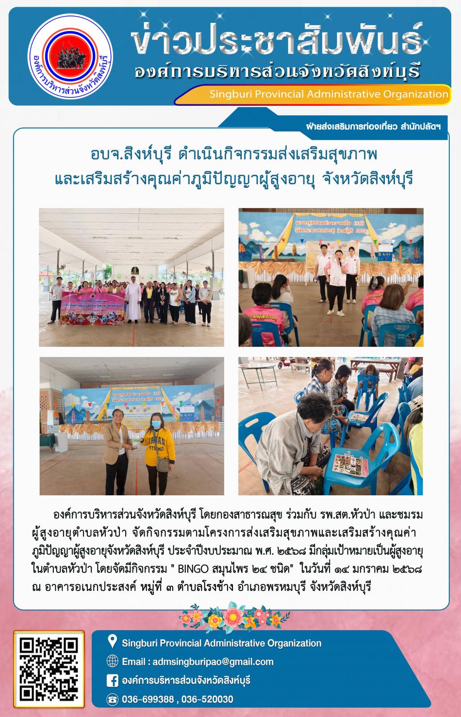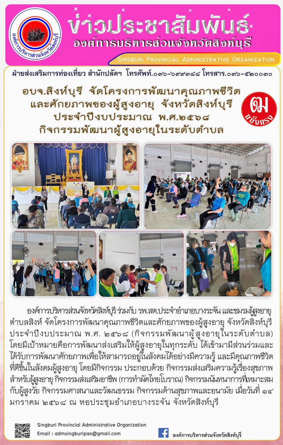 อบจ.สิงห์บุรี ดำเนินโครงการ ส่งเสริมสุขภาพและเสริมสร้างคุณค่าภูมิปัญญาผู้สูงอายุจังหวัดสิงห์บุรี [14 มกราคม 2568]
