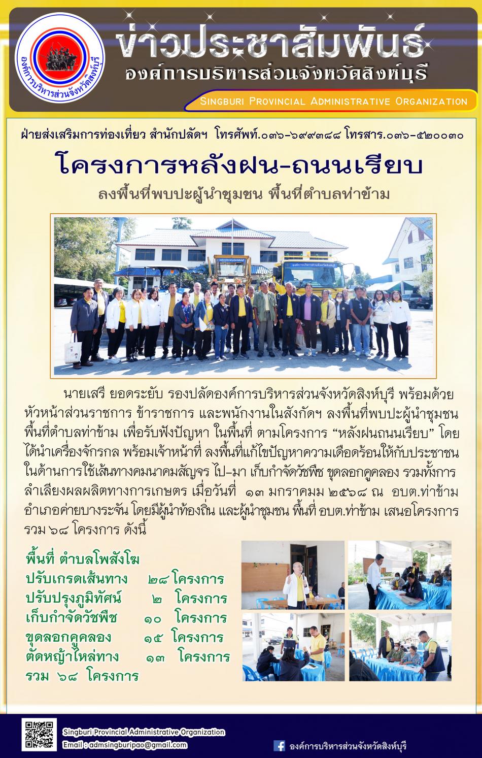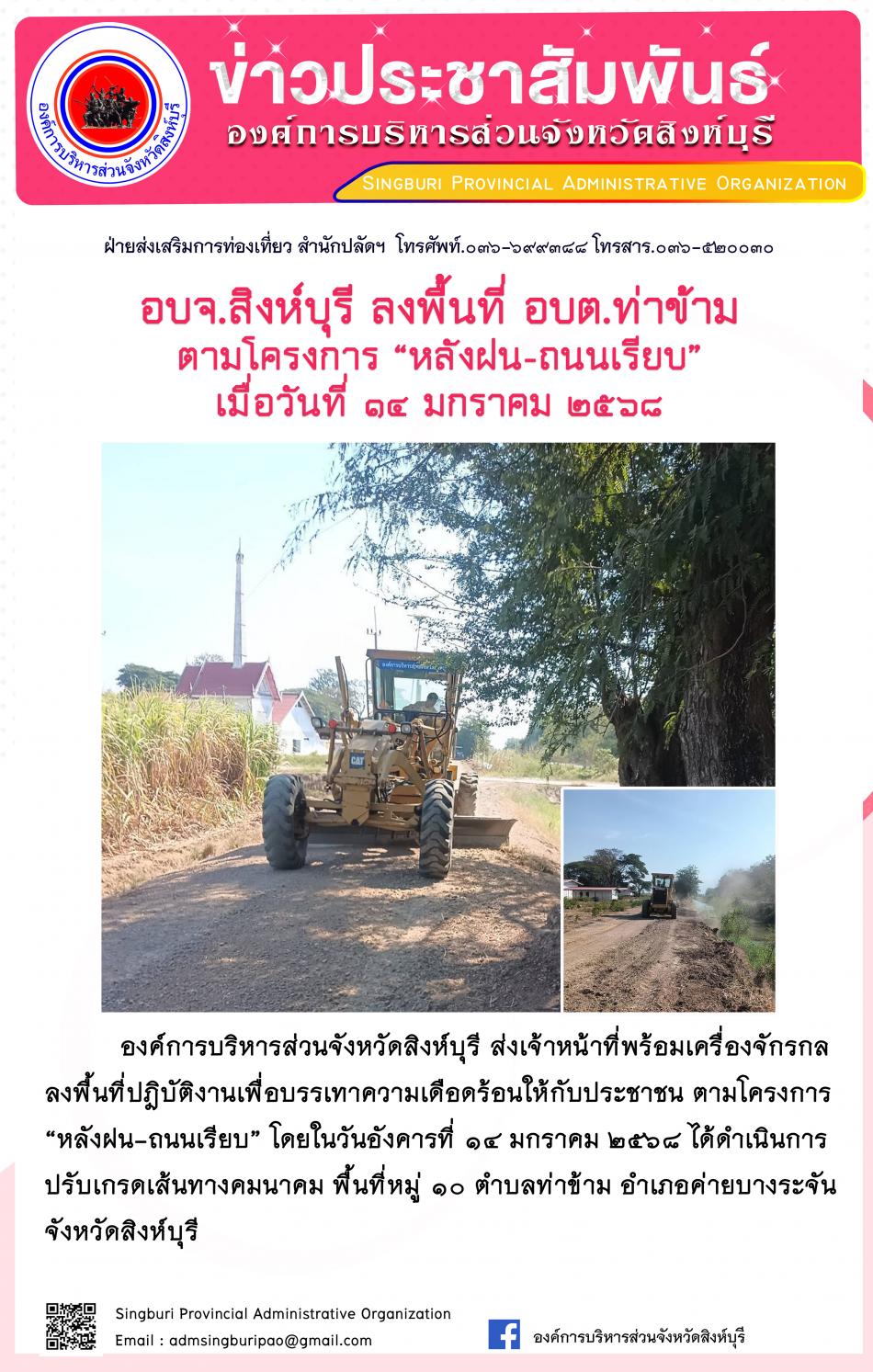 อบจ.สิงห์บุรี ลงพื้นที่ อบต.ท่าข้าม ตามโครงการ "หลังฝน - ถนนเรียบ" [14 มกราคม 2568]