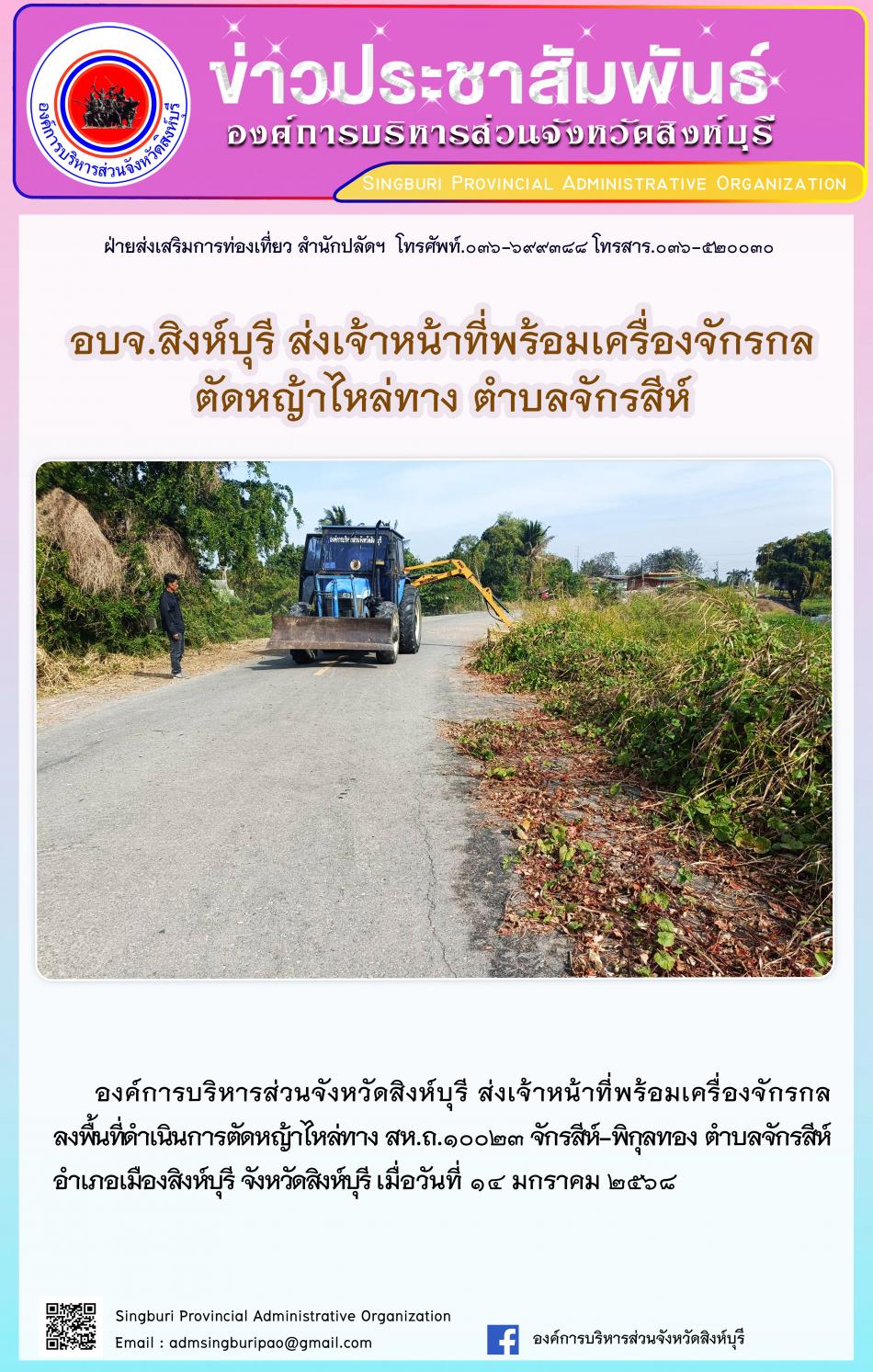 อบจ.สิงห์บุรี ส่งเจ้าหน้าที่ พร้อมเครื่องจักรกล ตัดหญ้าไหล่ทาง ตำบลจักรสีห์ [14 มกราคม 2568]