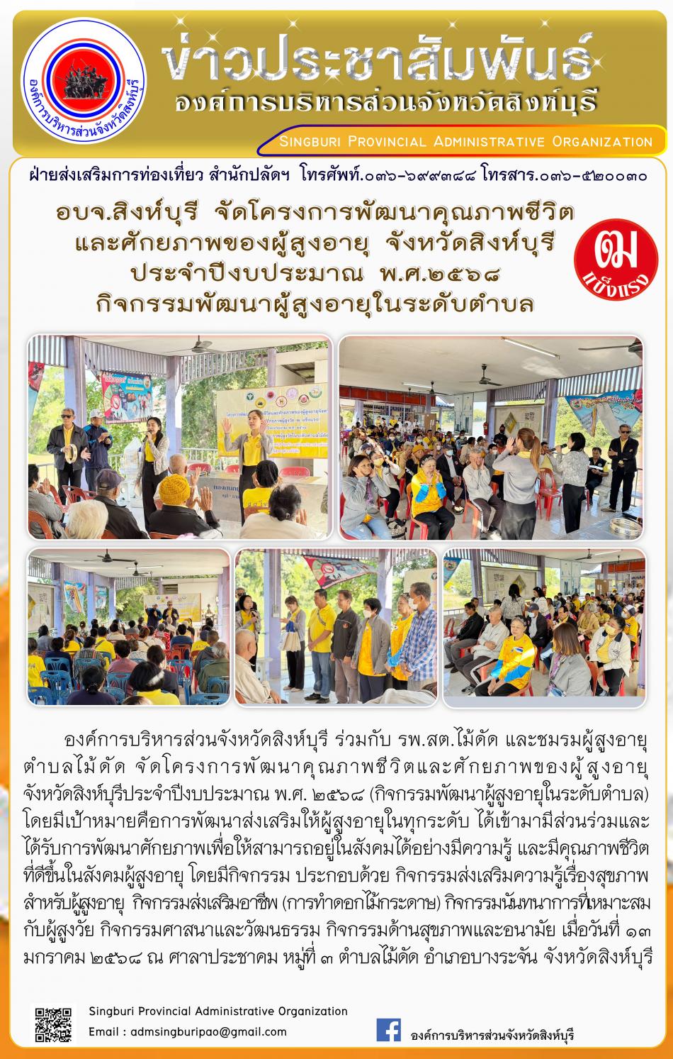 อบจ.สิงห์บุรี จัดโครงการพัฒนาคุณภาพชีวิตและศักยภาพของผู้สูงอายุ จังหวัดสิงห์บุรี ประจำปีงบประมาณ พ.ศ.2568 กิจกรรมพัฒนาผู้สูงอายุในระดับตำบล [13 มกราคม 2568]