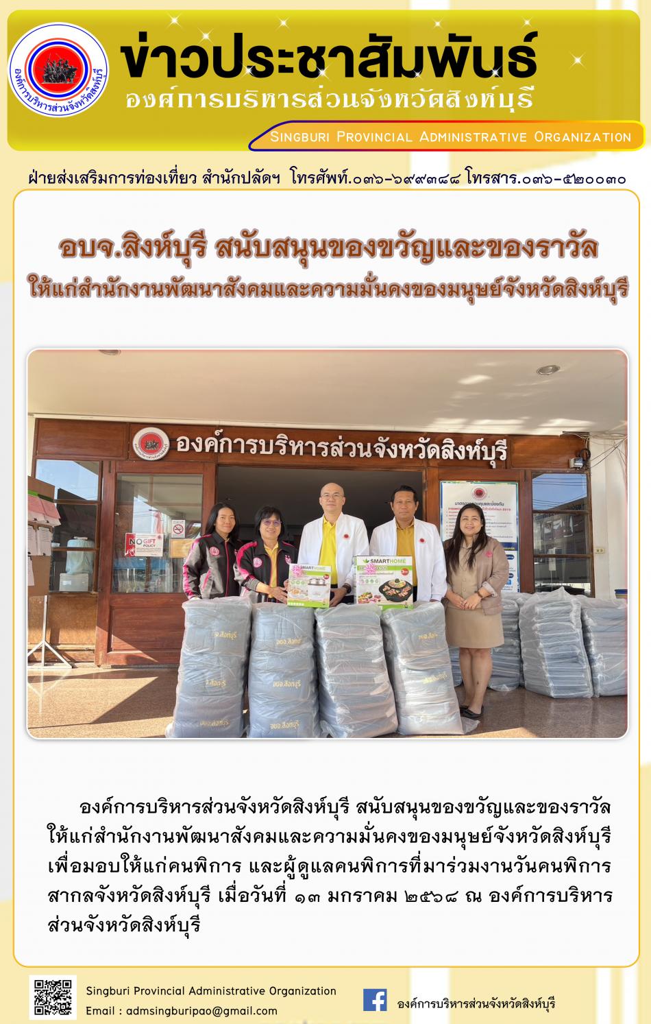 อบจ.สิงห์บุรี สนับสนุนของขวัญและของรางวัลให้แก่สำนักงานพัฒนาสังคมและความมั่นคงของมนุษย์จังหวัดสิงห์บุรี [13 มกราคม 2568]