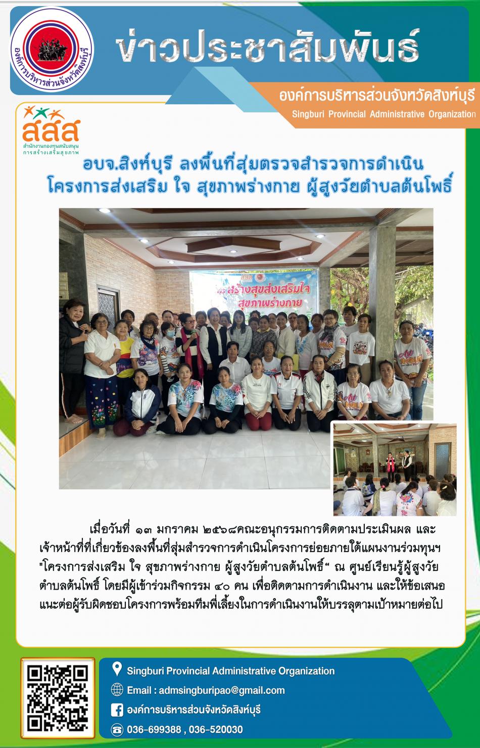 อบจ.สิงห์บุรี ลงพื้นที่สุ่มตรวจสำรวจการดำเนินโครงการส่งเสริม ใจ สุขภาพร่างกาย ผู้สูงวัยตำบลต้นโพธิ์ [13 มกราคม 2568]
