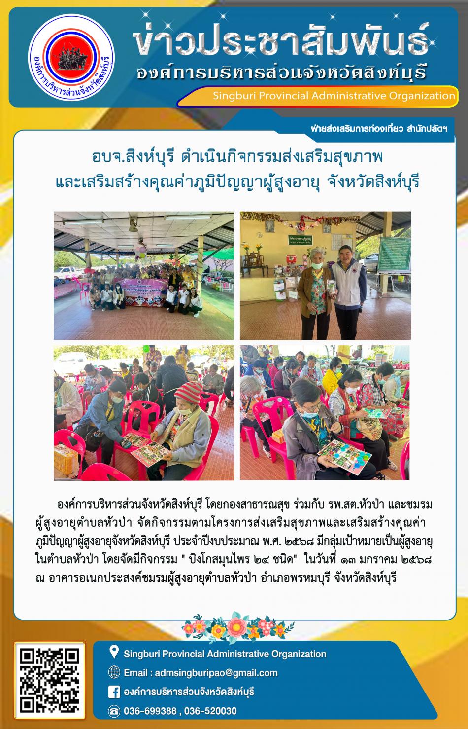 อบจ.สิงห์บุรี ดำเนินโครงการ ส่งเสริมสุขภาพและเสริมสร้างคุณค่าภูมิปัญญาผู้สูงอายุจังหวัดสิงห์บุรี [13 มกราคม 2568]