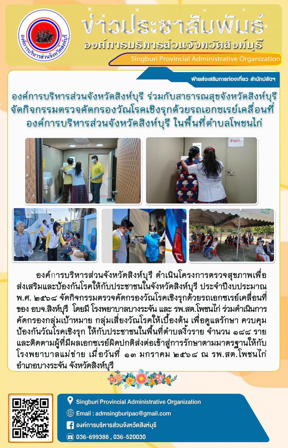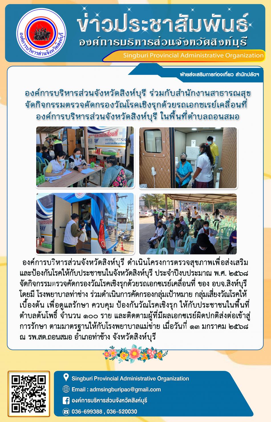 องค์การบริหารส่วนจังหวัดสิงห์บุรี ร่วมกับสาธารณสุขจังหวัดสิงห์บุรี จัดกิจกรรมตรวจคัดกรองวัณโรคเชิงรุกด้วยรถเอกซเรย์เคลื่อนที่ องค์การบริหารส่วนจังหวัดสิงห์บุรี ในพื้นที่ตำบลโพชนไก่ [13 มกราคม 2568]