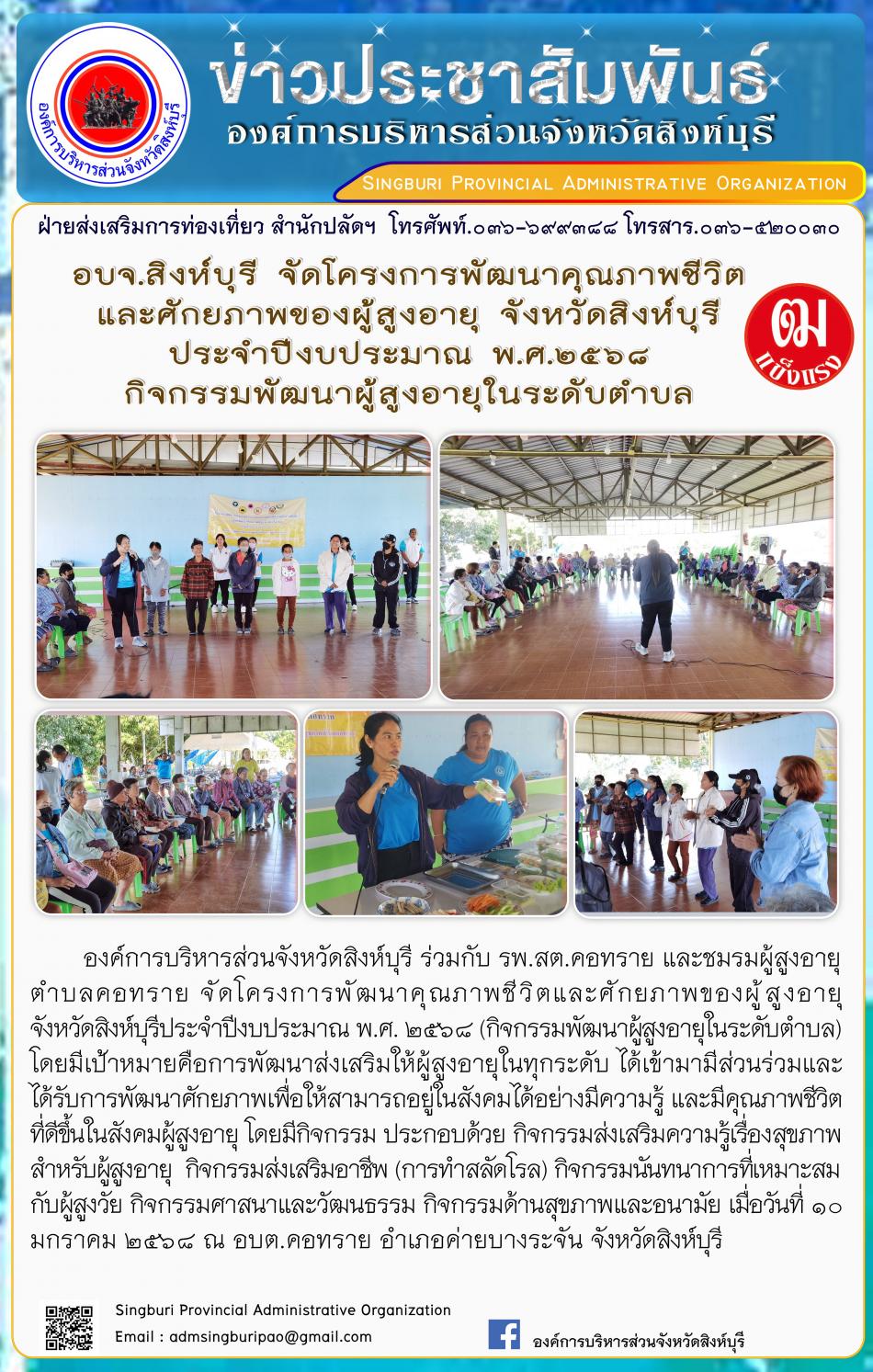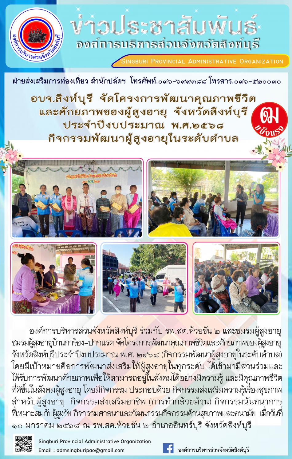 อบจ.สิงห์บุรี จัดโครงการพัฒนาคุณภาพชีวิตและศักยภาพผุ้สูงอายุจังหวัดสิงห์บุรี ประจำปีงบประมาณพ.ศ.2568 กิจกรรมพัฒนาผู้สูงอายุในระดับตำบล [10 มกราคม 2568]