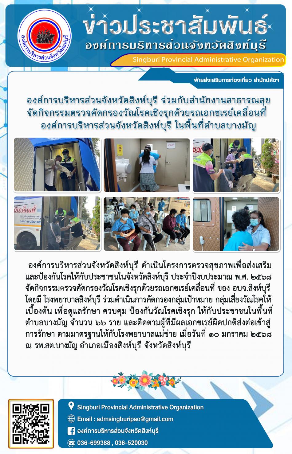 องค์การบริหารส่วนจังหวัดสิงห์บุรี ร่วมกับสาธาณสุขจังหวัดสิงห์บุรี จัดกิจกรรมตรวจคัดกรองวัณโรคเชิงรุกด้วยรถเอกซเรย์เคลื่อนที่ องค์การบริหารส่วนจังหวัดสิงห์บุรี ในพื้นที่ตำบลบางมัญ [10 มกราคม 2568]