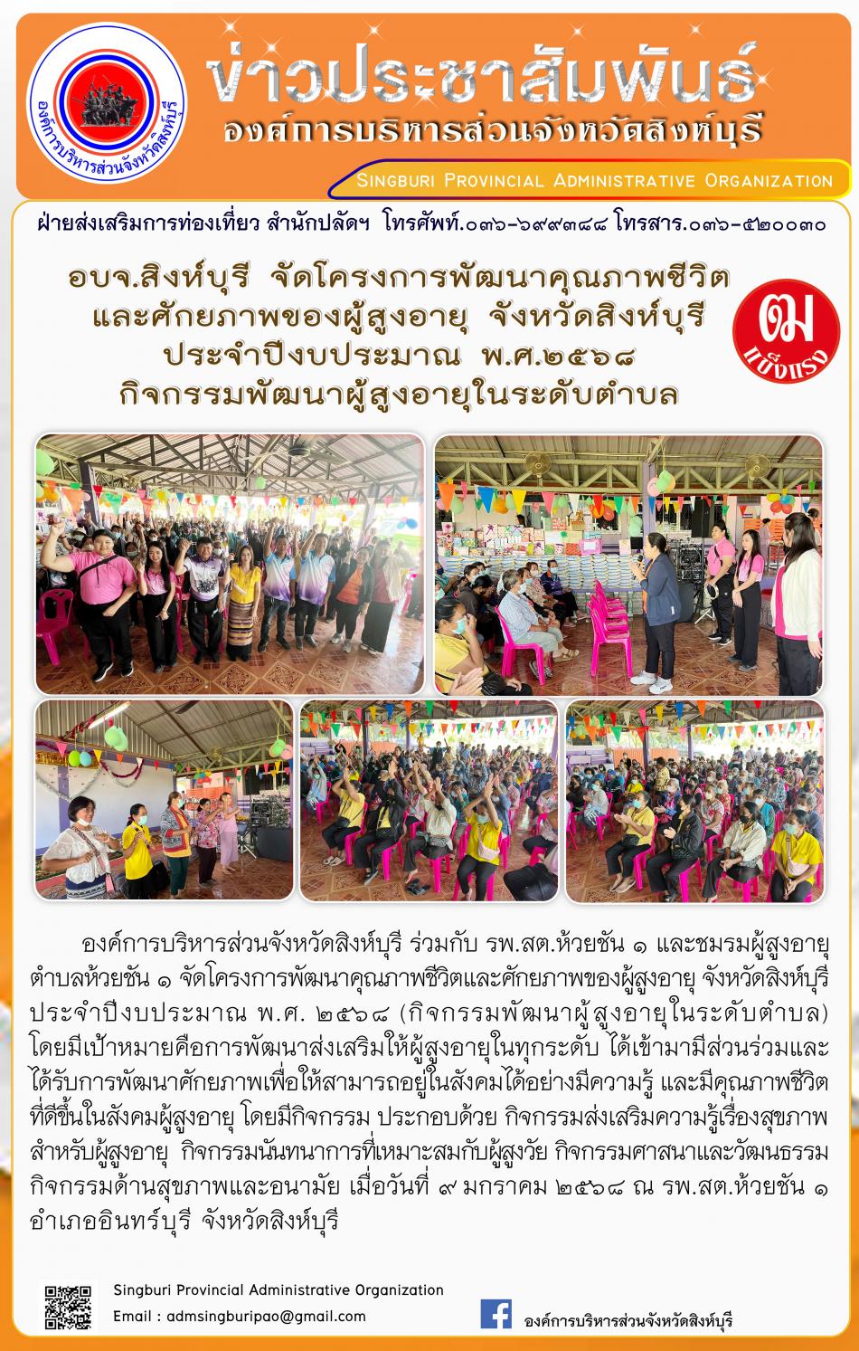 อบจ.สิงห์บุรี จัดโครงการพัฒนาคุณภาพชีวิตและศักยภาพผุ้สูงอายุจังหวัดสิงห์บุรี ประจำปีงบประมาณพ.ศ.2568 กิจกรรมพัฒนาผู้สูงอายุในระดับตำบล [9 มกราคม 2568]