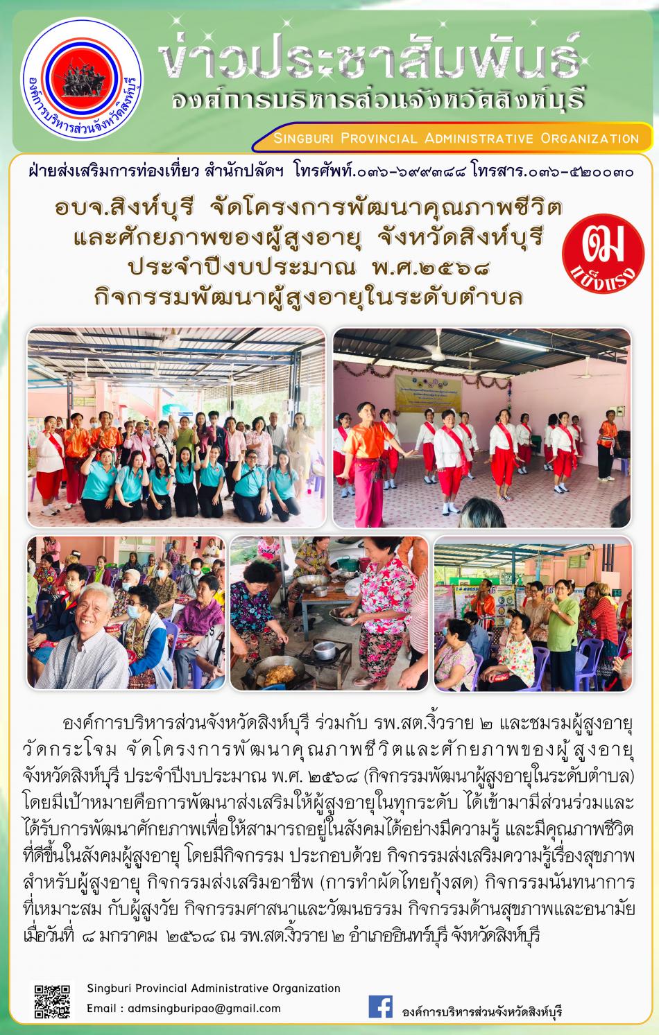 อบจ.สิงห์บุรี จัดโครงการพัฒนาคุณภาพชีวิตและศักยภาพผุ้สูงอายุจังหวัดสิงห์บุรี ประจำปีงบประมาณพ.ศ.2568 กิจกรรมพัฒนาผู้สูงอายุในระดับตำบล [8 มกราคม 2568]