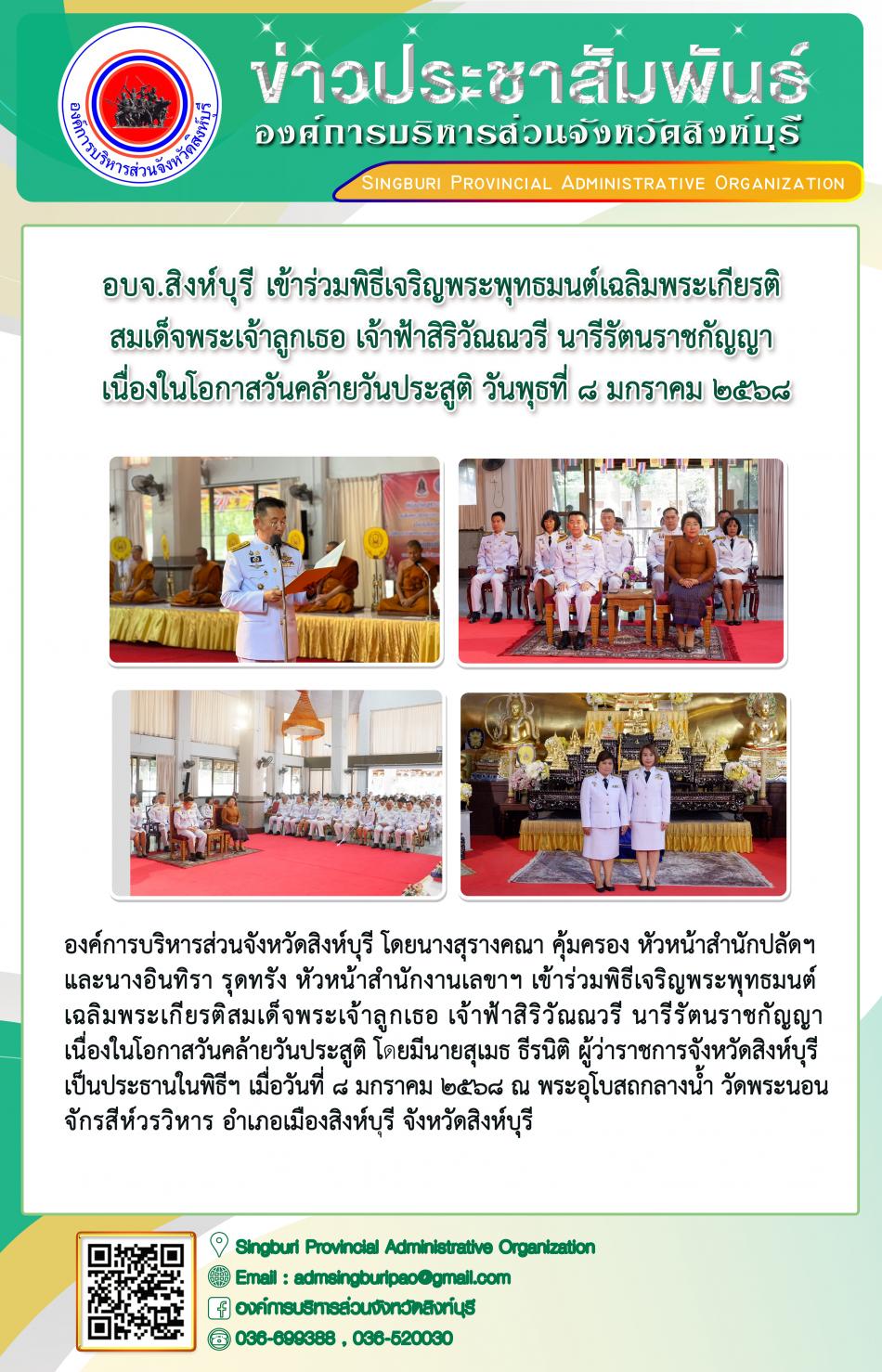 อบจ.สิงห์บุรี เข้าร่วมพิธีเจริญพระพุทธมนต์เฉลิมพระเกียรติสมเด็จพระเจ้าลูกยาเธอ เจ้าฟ้าสิริวัณณวรี นารีรัตนราชกัญญา เนื่องในโอกาสวันคล้ายวันประสูติ [8 มกราคม 2568]