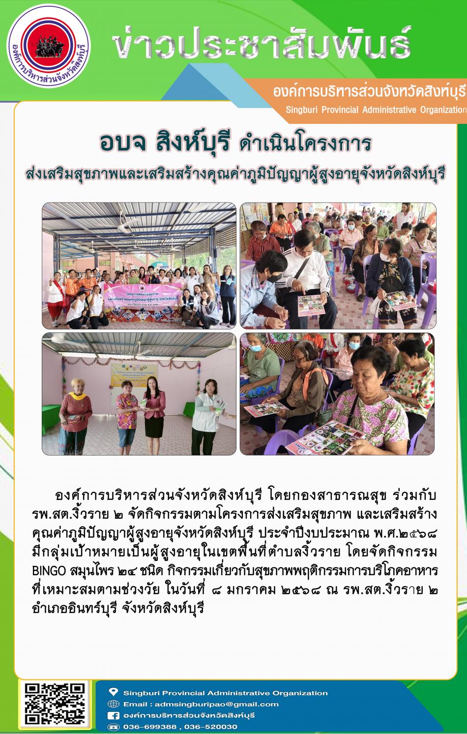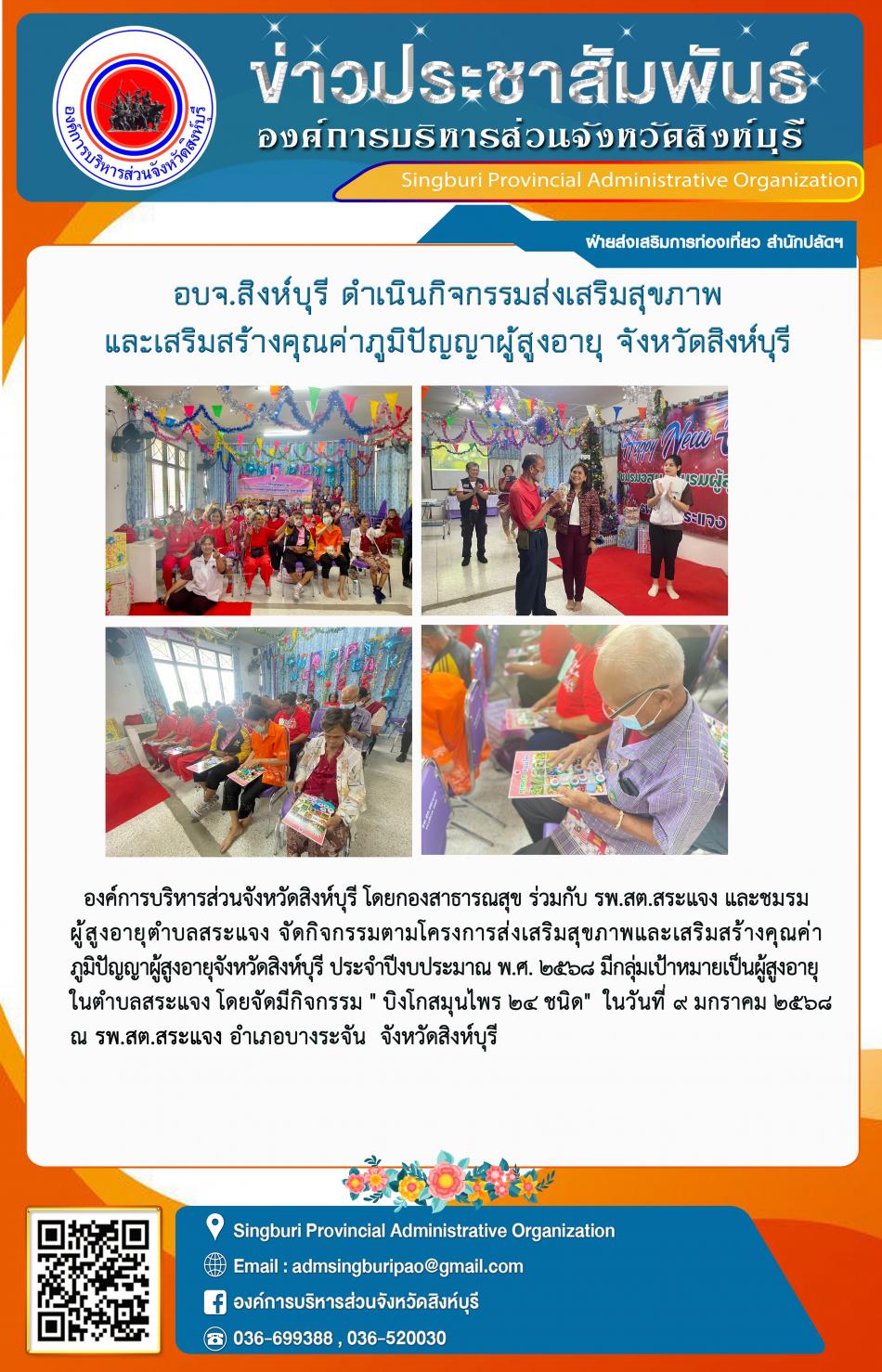 อบจ.สิงห์บุรี ดำเนินกิจกรรมส่งเสริมสุขภาพ สร้างจิตใจที่แจ่มใสให้กับผู้สุงอายุ จังหวัดสิงห์บุรี [9 มกราคม 2568]
