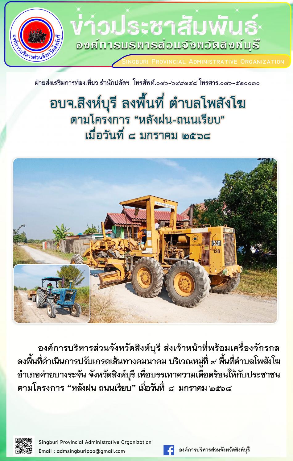 อบจ.สิงห์บุรี ลงพื้นที่ ตำบลโพสังโฆ ตามโครงการ "หลังฝน - ถนนเรียบ" [8 มกราคม 2568]