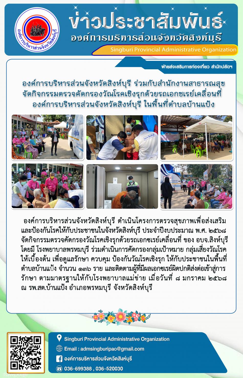 องค์การบริหารส่วนจังหวัดสิงห์บุรี ร่วมกับสาธาณสุขจังหวัดสิงห์บุรี จัดกิจกรรมตรวจคัดกรองวัณโรคเชิงรุกด้วยรถเอกซเรย์เคลื่อนที่ องค์การบริหารส่วนจังหวัดสิงห์บุรี ในพื้นที่ตำบลบ้านแป้ง [8 มกราคม 2568]