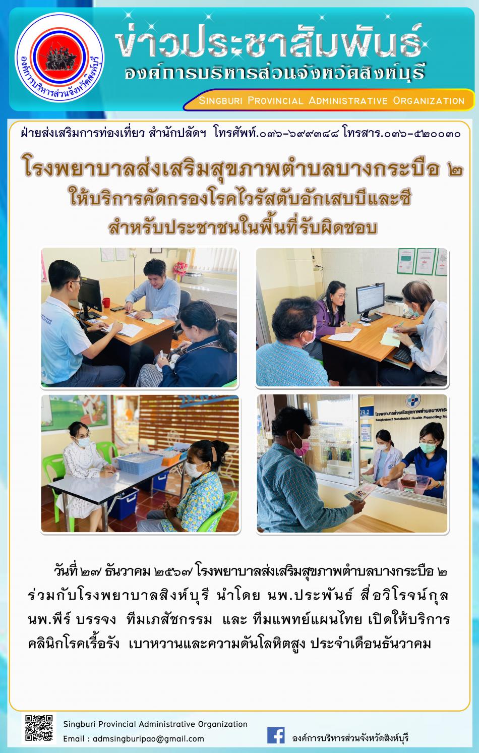 โรงพยาบาลส่งเสริมสุขภาพตำบลบางกระบือ 2 ให้บริการคัดกรองโรคไวรัสตับอักเสบบีและซี สหรับประชาชนในพื้นที่รับผิดชอบ [27 ธันวาคม 2567]