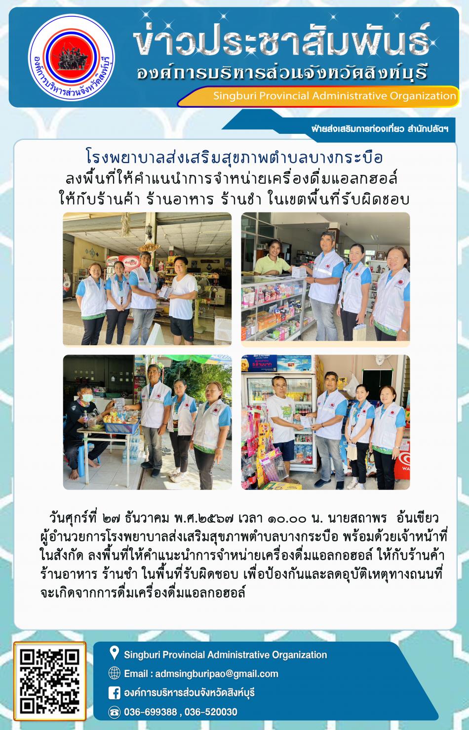 โรงพยาบาลส่งเสริมสุขภาพตำบลบางกระบือ ลงพื้นที่ให้คำแนะนำการจำหน่ายเครื่องดื่มแอลกฮอล์ให้กับร้านค้า ร้านอาหาร ร้านชำ ในเขตพื้นที่รับผิดชอบ [27 ธันวาคม 2567]