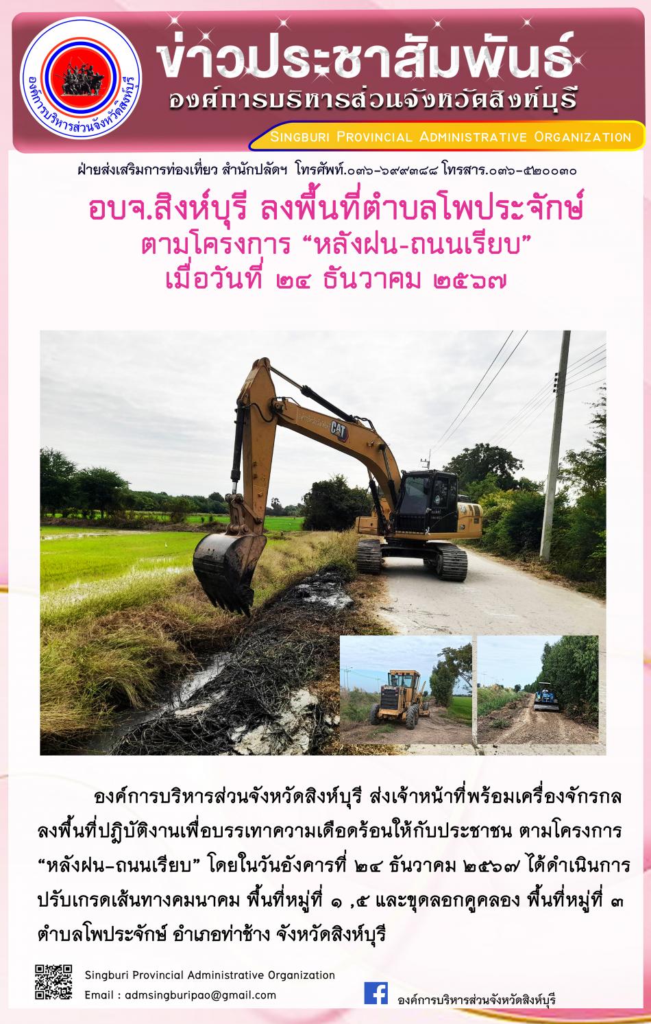 อบจ.สิงห์บุรี ลงพื้นที่ ตำบลโพประจักษ์ ตามโครงการ "หลังฝน - ถนนเรียบ" [24 ธันวาคม 2567]