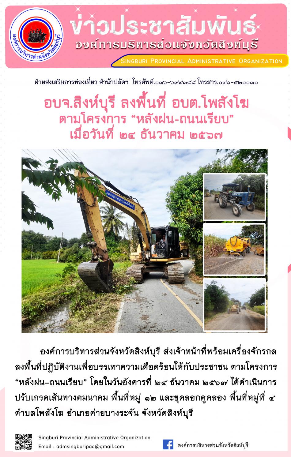 อบจ.สิงห์บุรี ลงพื้นที่ อบต.โพสังโฆ ตามโครงการ "หลังฝน - ถนนเรียบ" [24 ธันวาคม 2567]