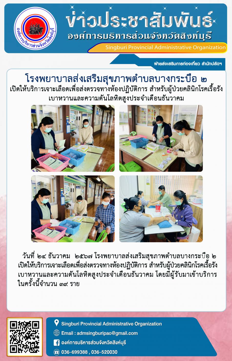 โรงพยาบาลส่งเสริมสุขภาพตำบลบางกระบือ 2 เปิดให้บริการเจาะเลือดเพื่อส่งตรวจทางห้องปฏิบัติการ สำหรับผู้ป่วยคลินิกโรคเรื้องรัง เบาหวานและความดันโลหิตสูงประจำเดือนธันวาคม [24 ธันวาคม 2567]