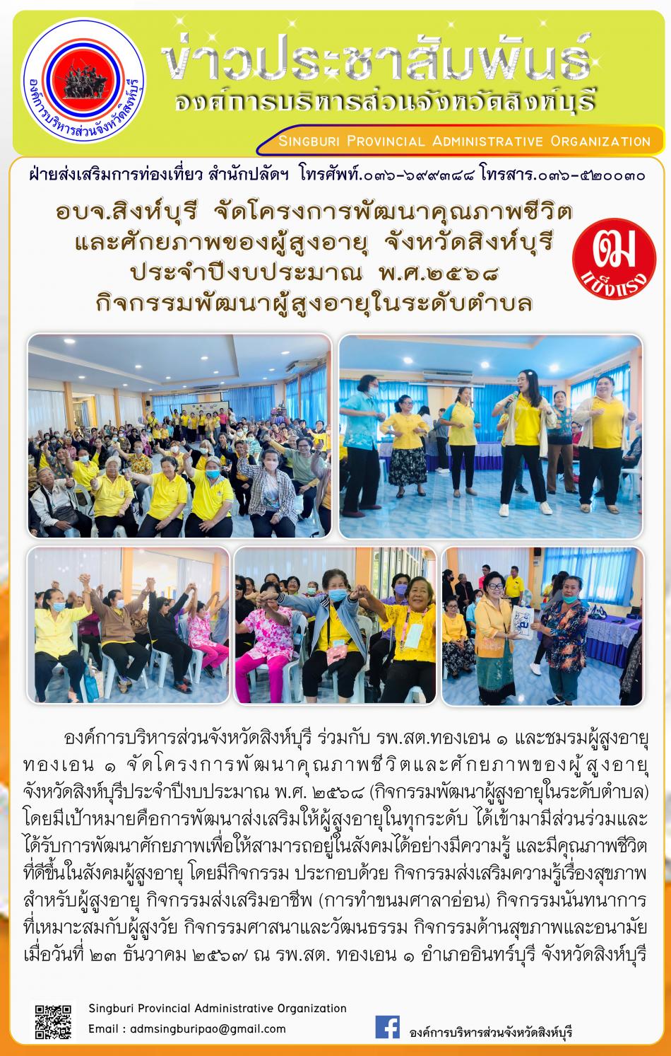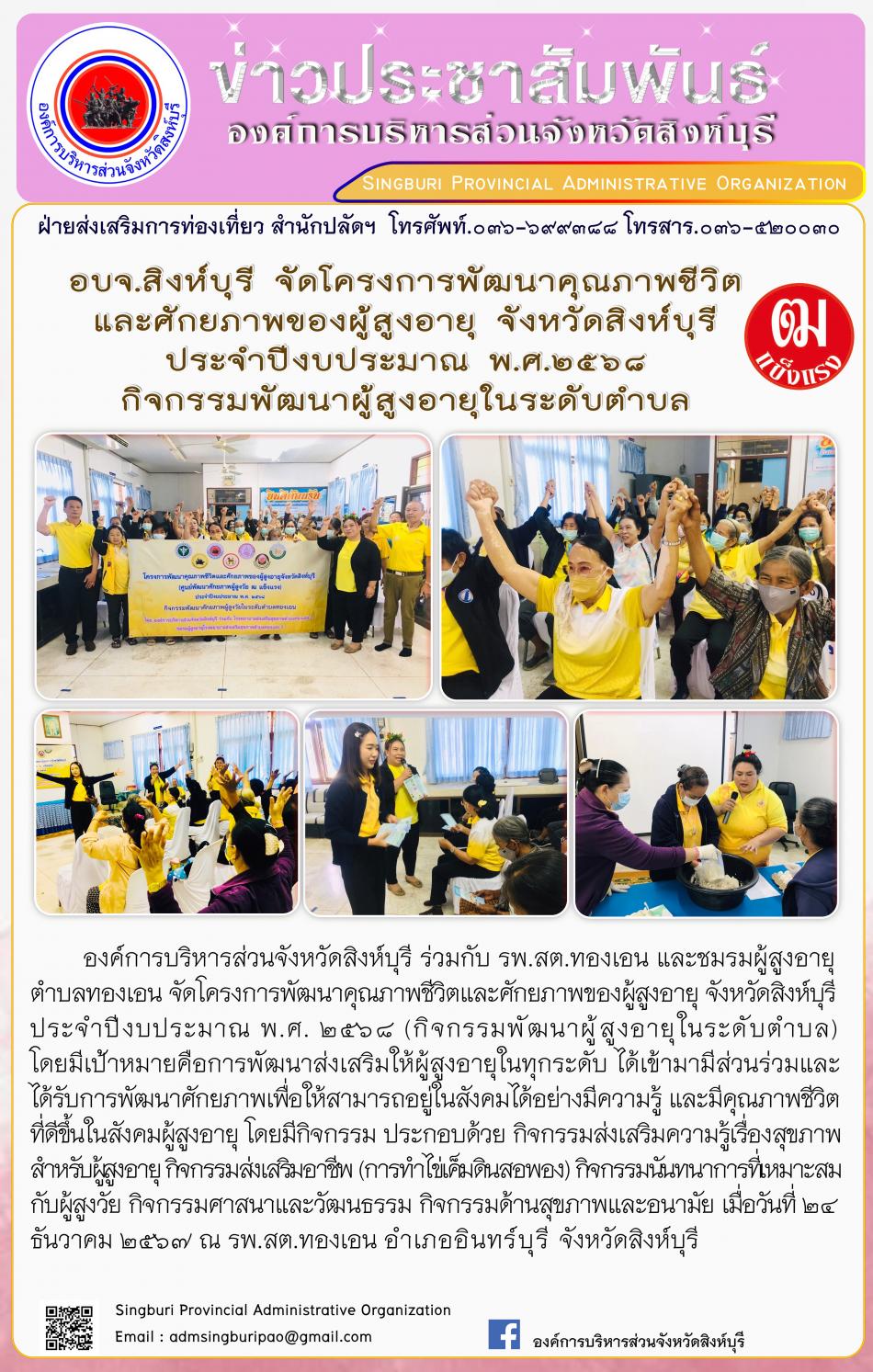 อบจ.สิงห์บุรี จัดโครงการพัฒนาคุณภาพชีวิตและศักยภาพผุ้สูงอายุจังหวัดสิงห์บุรี ประจำปีงบประมาณพ.ศ.2568 กิจกรรมพัฒนาผู้สูงอายุในระดับตำบล [24 ธันวาคม 2567]