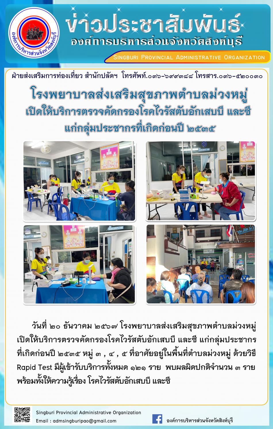 โรงพยาบาลส่งเสริมสุขภาพตำบลม่วงหมู่ เปิดให้บริการตรวจคัดกรองโรคไวรัสตับอักเสบบี และซี แก่กลุ่มประชากรที่เกิดก่อนปี 2535 [20 ธันวาคม 2567]