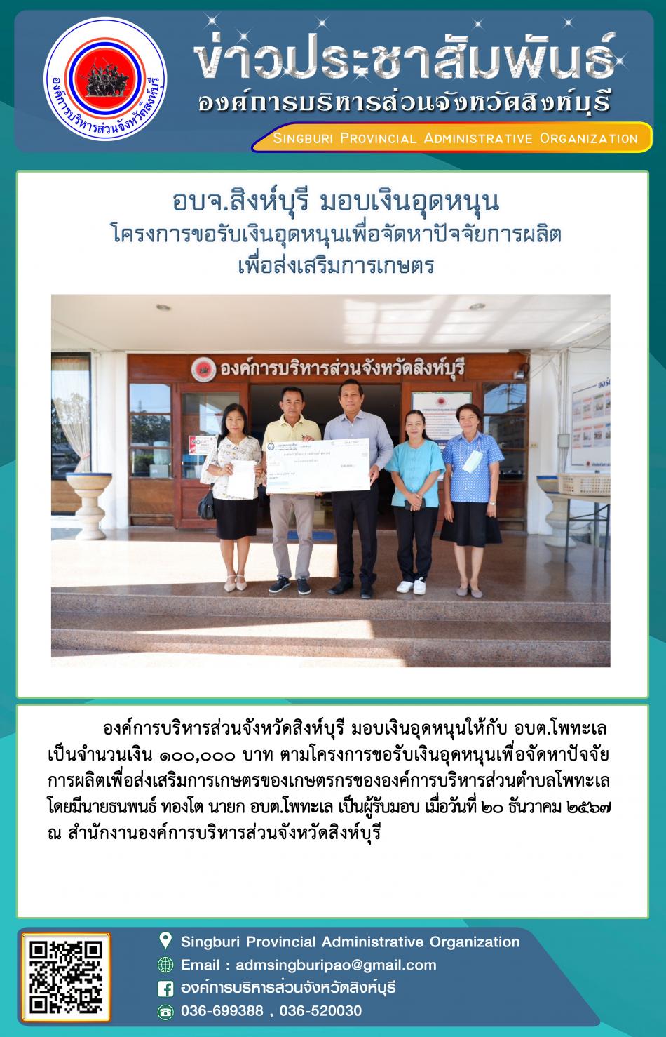 อบจ.สิงห์บุรี มอบเงินอุดหนุนโครงการขอรับเงินอุดหนุนเพื่อจัดหาปัจจัยการผลิตเพื่อส่งเสริมการเกษตร [20 ธันวาคม 2567]