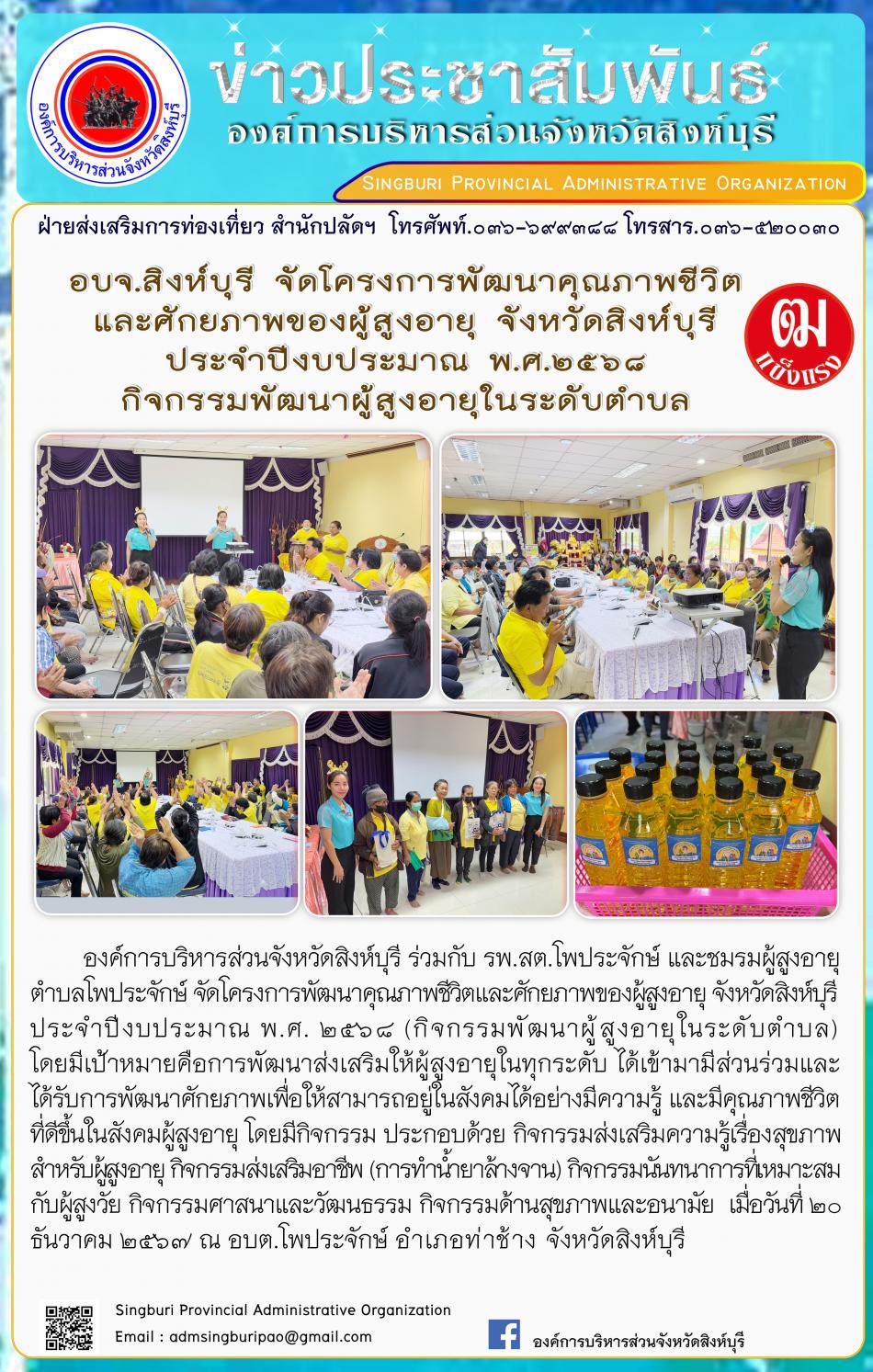 อบจ.สิงห์บุรี จัดโครงการพัฒนาคุณภาพชีวิตและศักยภาพผุ้สูงอายุจังหวัดสิงห์บุรี ประจำปีงบประมาณพ.ศ.2568 กิจกรรมพัฒนาผู้สูงอายุในระดับตำบล [20 ธันวาคม 2567]
