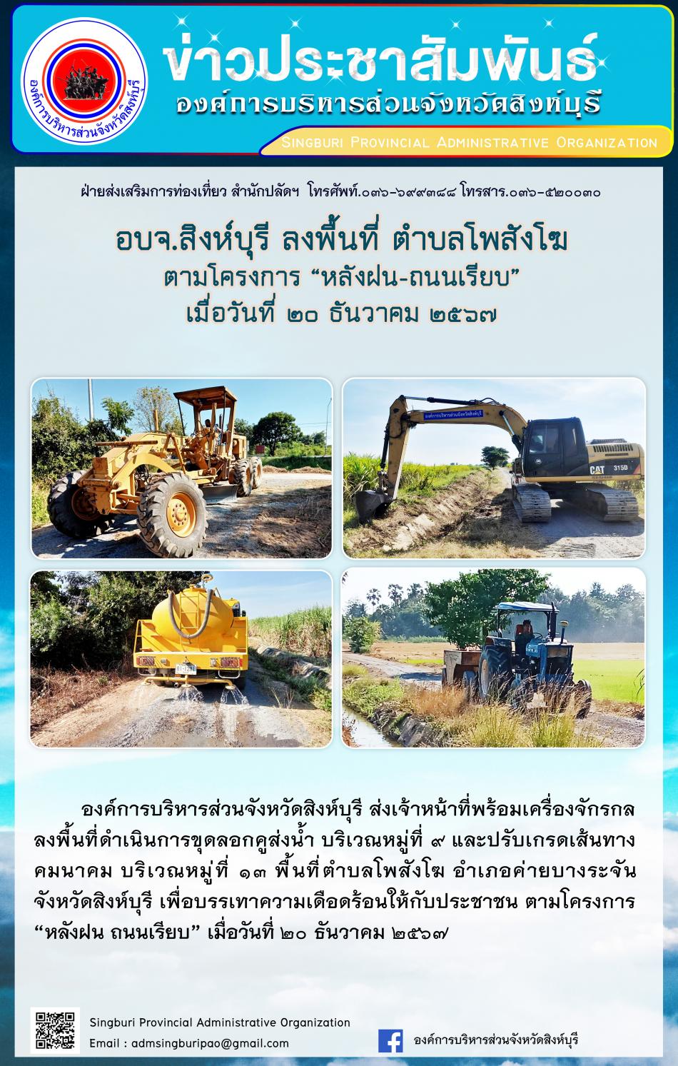 อบจ.สิงห์บุรี ลงพื้นที่ ตำบลโพสังโฆ ตามโครงการ "หลังฝน - ถนนเรียบ" [20 ธันวาคม 2567]