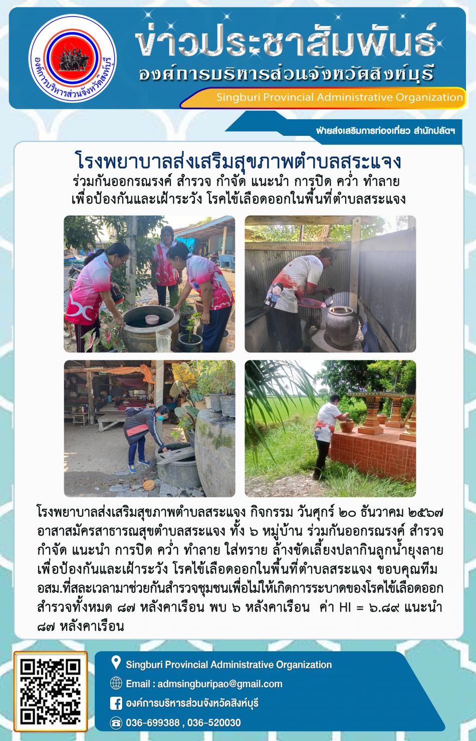 โรงพยาบาลส่งเสริมสุขภาพตำบลสระแจง ร่วมกันออกรณรงค์ สำรวจ กำจัด แนะนำ การปิด คว่ำ ทำลาย เพื่อป้องกันและเฝ้าระวัง โรคไข้เลือดออกในพื้นที่ตำบลสระแจง [20 ธันวาคม 2567]