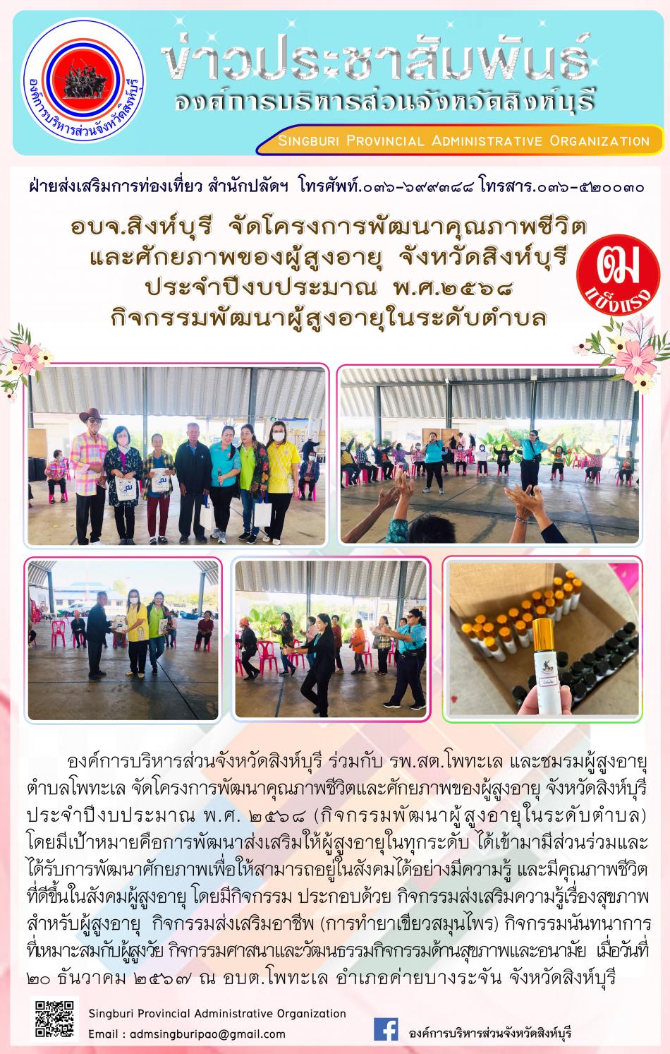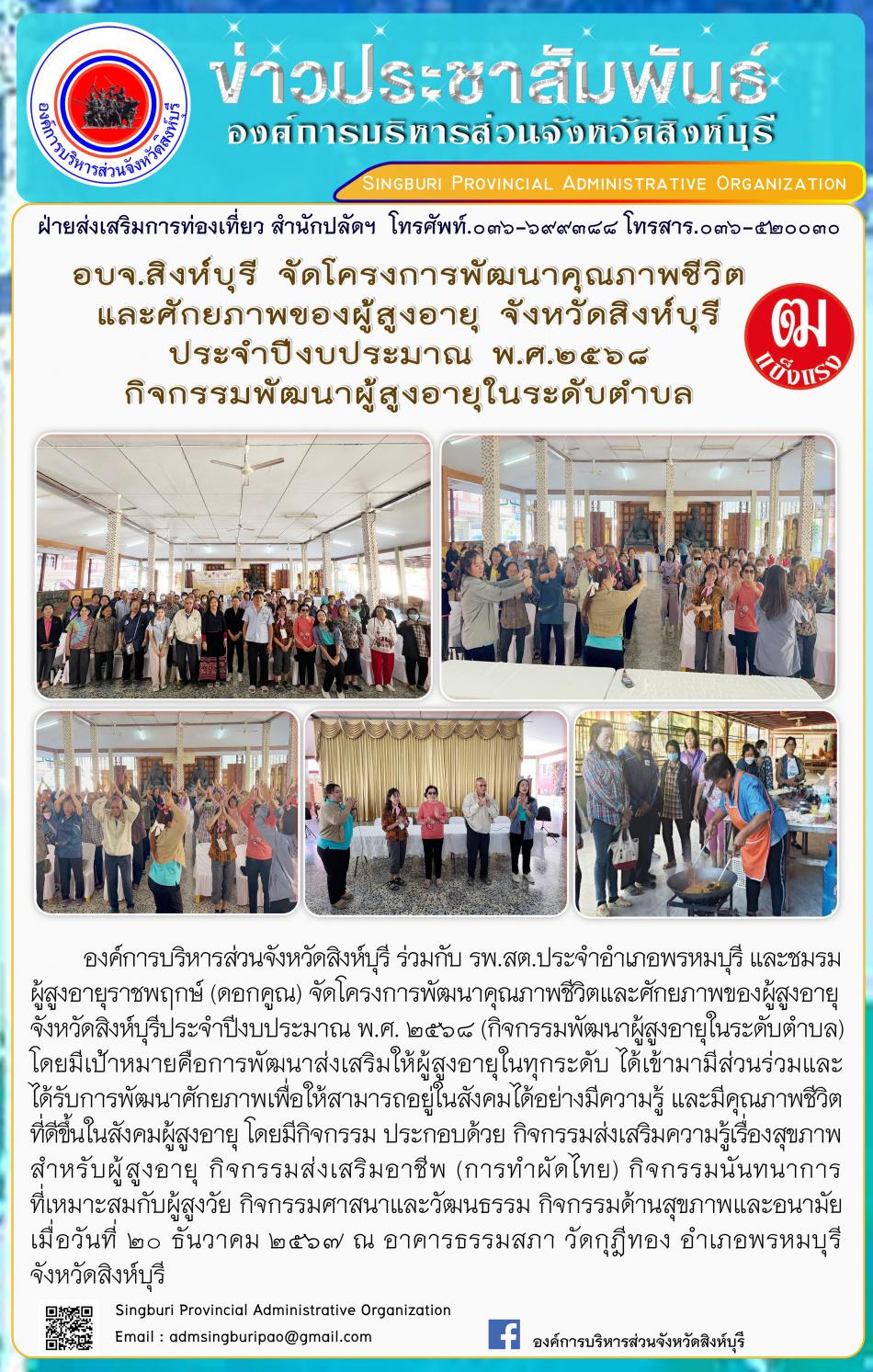 อบจ.สิงห์บุรี จัดโครงการพัฒนาคุณภาพชีวิตและศักยภาพผุ้สูงอายุจังหวัดสิงห์บุรี ประจำปีงบประมาณพ.ศ.2568 กิจกรรมพัฒนาผู้สูงอายุในระดับตำบล [20 ธันวาคม 2567]