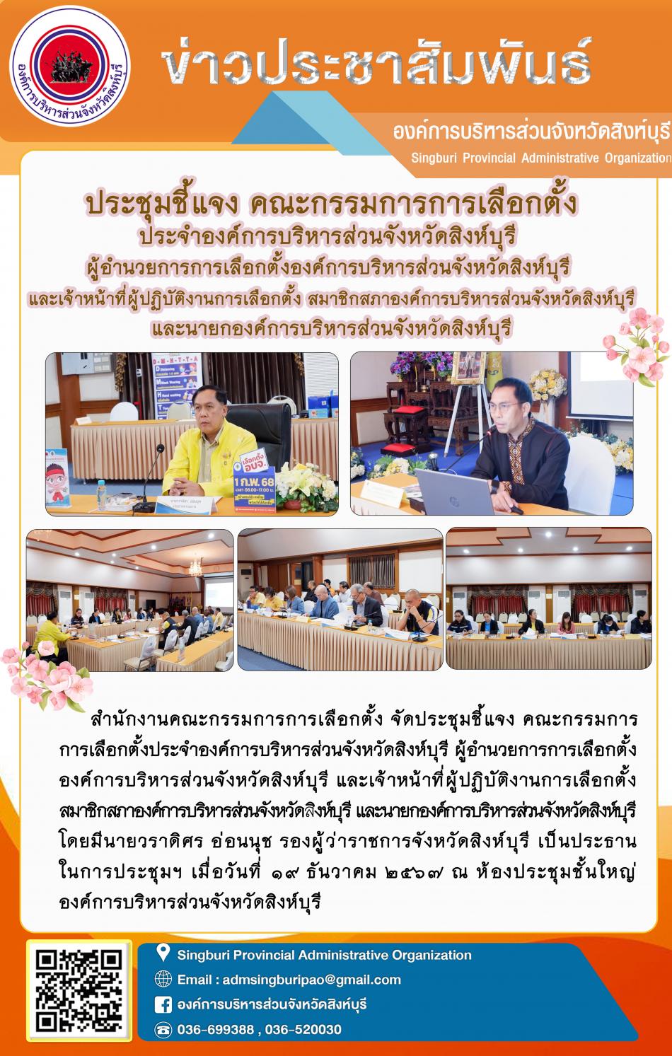 ประชุมชี้แจง คณะกรรมการการเลือกตั้ง ประจำองค์การบริหารส่วนจังหวัดสิงห์บุรี ผู้อำนวยการเลือกตั้งองค์การบริหารส่วนจังหวัดสิงห์บุรี และเจ้าหน้าที่ผู้ปฏิบัติงานการเลือกตั้ง... [19 ธันวาคม 2567]