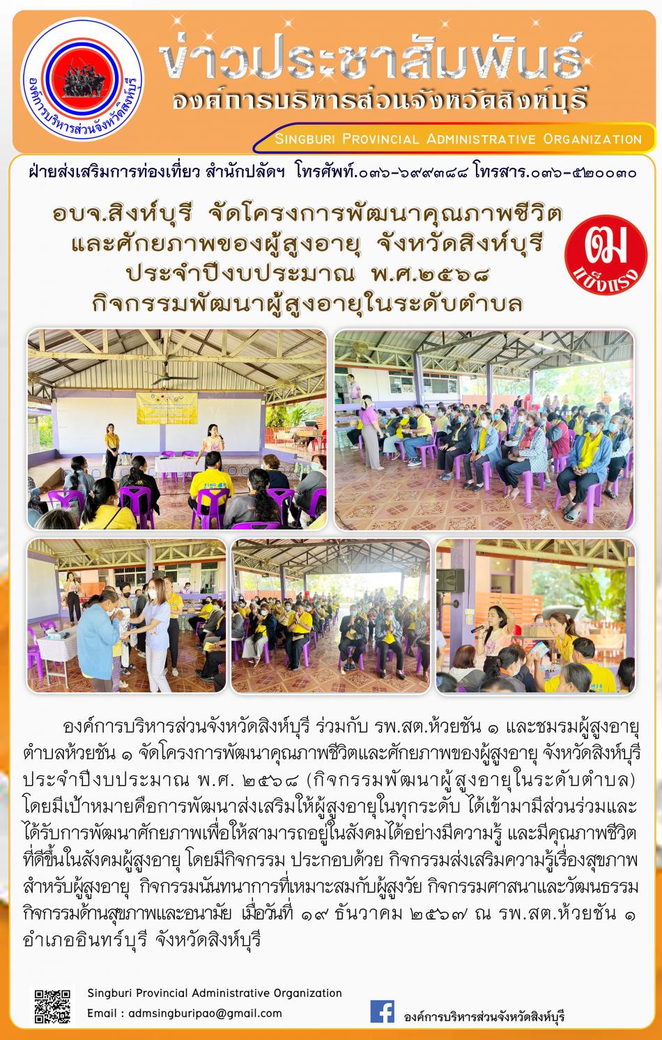 อบจ.สิงห์บุรี จัดโครงการพัฒนาคุณภาพชีวิตและศักยภาพผุ้สูงอายุจังหวัดสิงห์บุรี ประจำปีงบประมาณพ.ศ.2568 กิจกรรมพัฒนาผู้สูงอายุในระดับตำบล [19 ธันวาคม 2567]