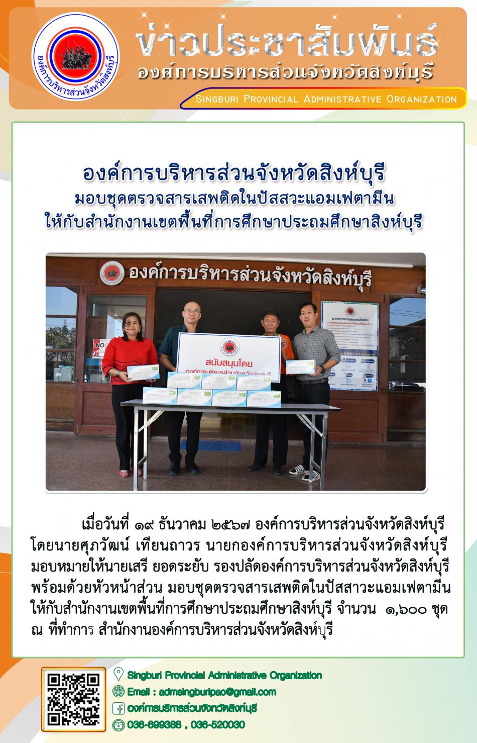 องค์การบริหารส่วนจังหวัดสิงห์บุรี มอบชุดตรจสารเสพติดในปัสสวะแอมเฟตามีนให้กับสำนักงานเขตพื้นที่การศึกษาประถมศึกษาสิงห์บุรี [19 ธันวาคม 2567]